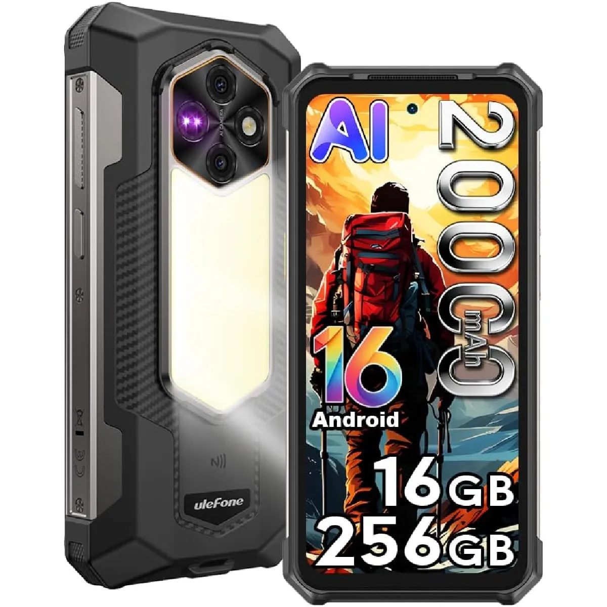 Ulefone Rugking 5 Pro Smartphone Portable Incassable Android 16, 16Go+256Go/2TB Téléphone Débloqué, 20000mAh, Lampe LED 1000 lumens, 6.78" FDH+