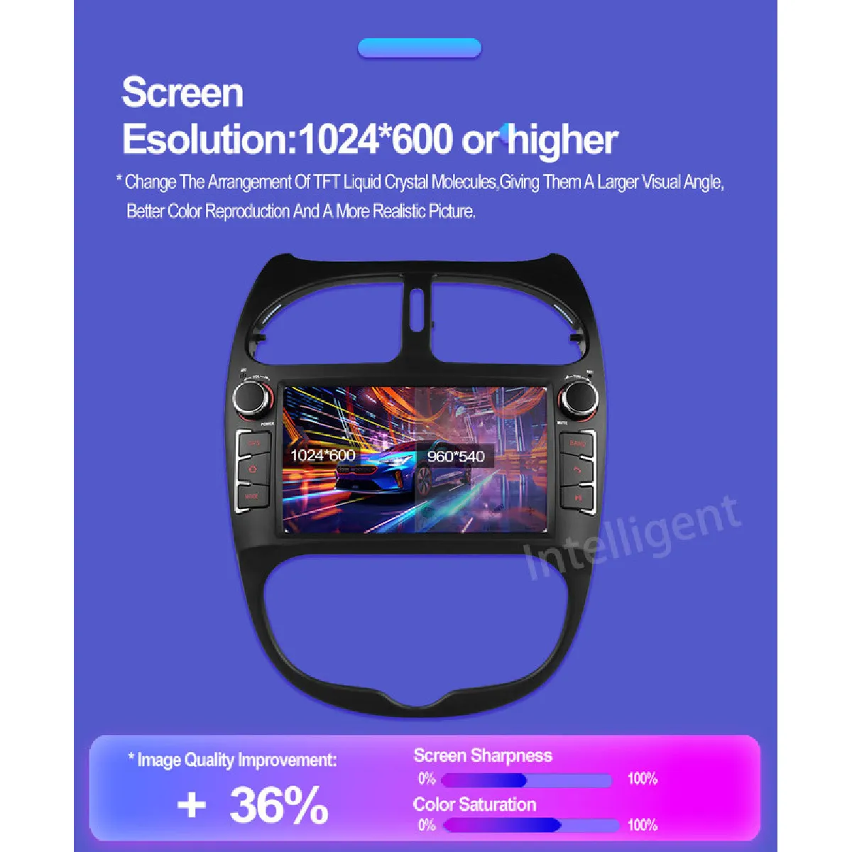 Écran IPS 7 pouces, résolution 1024 x 600, technologie Android 13, processeur DSP pour un son haute qualité ajustable.