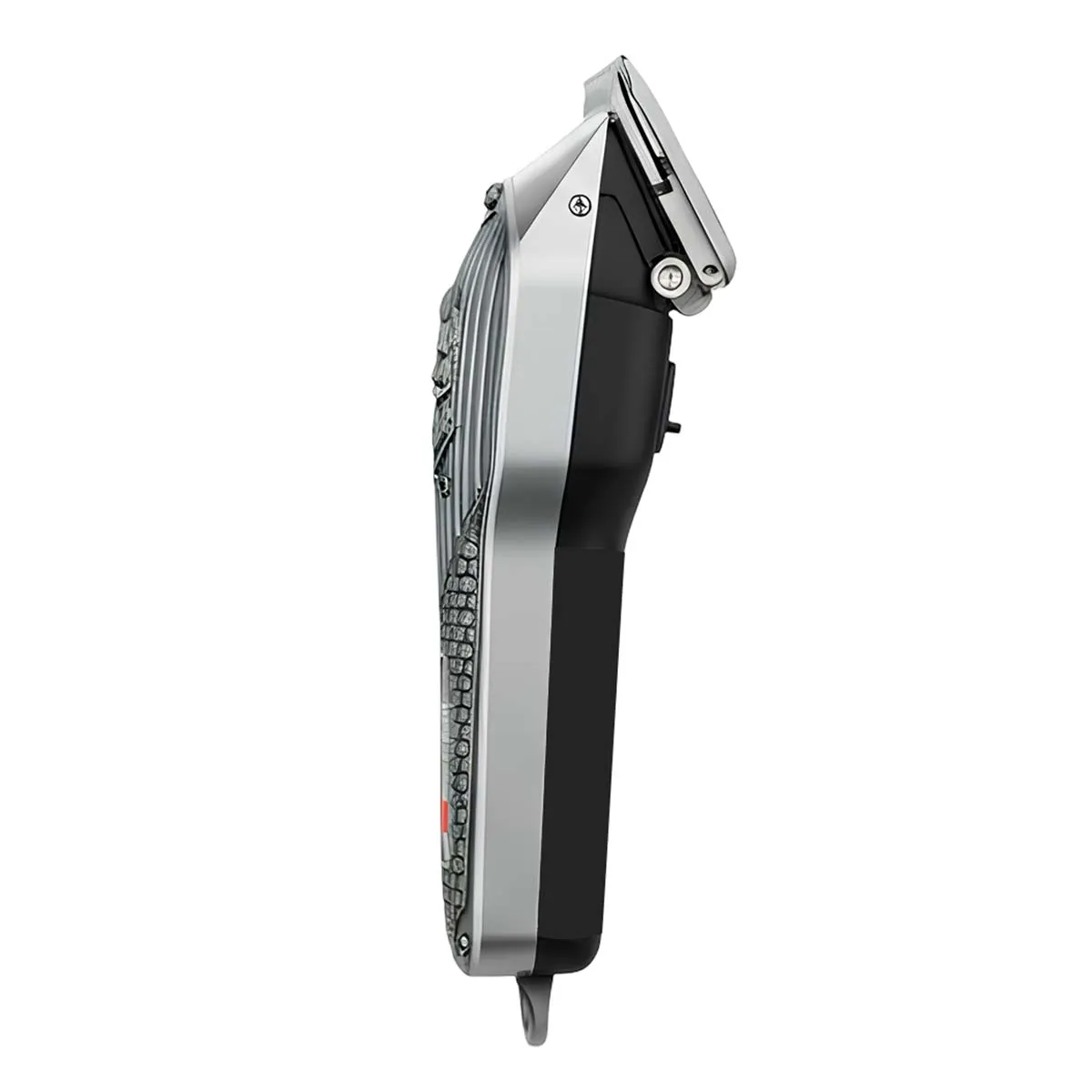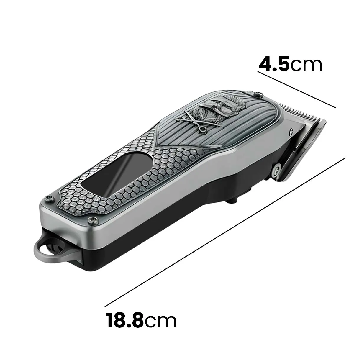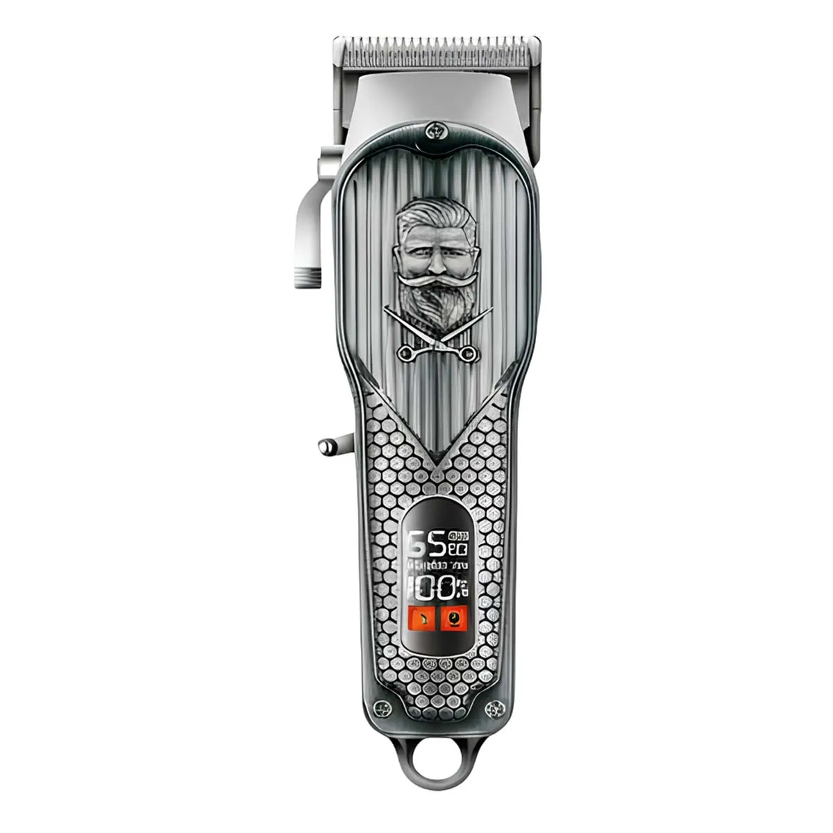 Cette tondeuse sans fil est conçue pour un usage domestique exigeant. Son boîtier distinctif associe une façade gravée style barbier avec motifs ciseaux et barbe, ainsi qu'une texture hexagonale antidérapante pour une prise en main stable. Le moteur haute performance 337 délivre une puissance de 5W pour une coupe nette et régulière. Sa batterie 2000mAh offre environ 100 minutes d'autonomie. Dotée d'un écran LED.