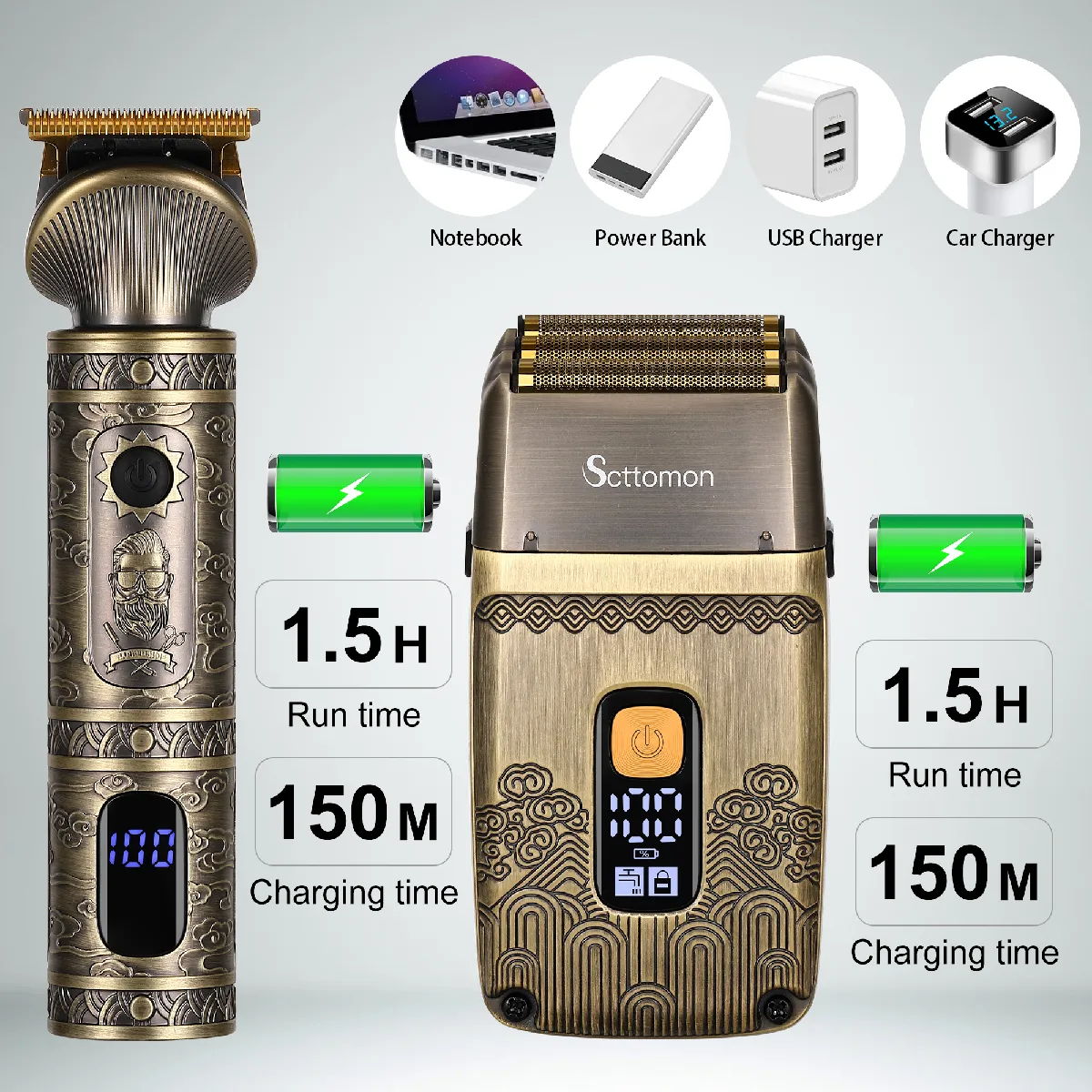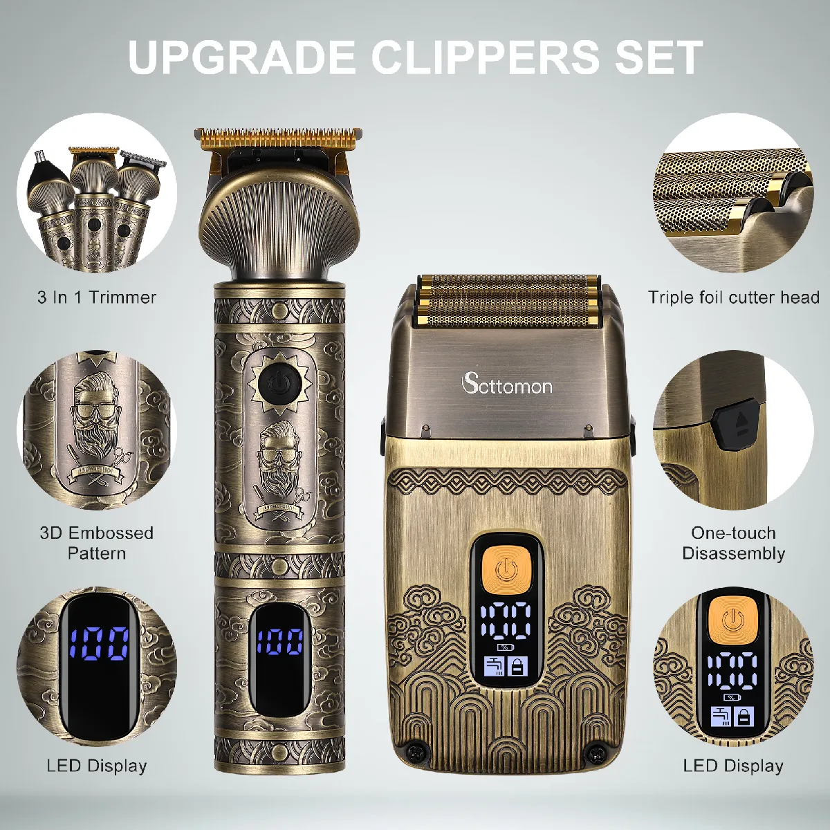 Affichage LED et verrouillage de voyage : Le rasoir électrique et la tondeuse à cheveux sont tous deux équipés d'écrans LCD intelligents qui s'allument d'une simple pression et affichent clairement le niveau de la batterie, les rappels de nettoyage et les symboles de verrouillage de voyage pour un confort supplémentaire. La conception étanche IPX7 permet un nettoyage et un entretien faciles.
