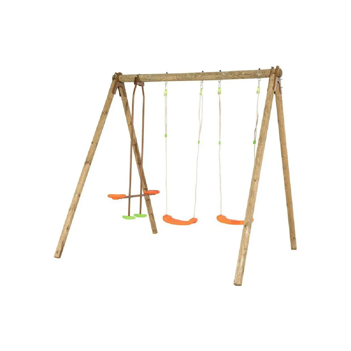 Portique en bois traité autoclave Aléo by Trigano Darifou, 2,30 m, 2 balançoires orange + face-à-face, 3 à 12 ans