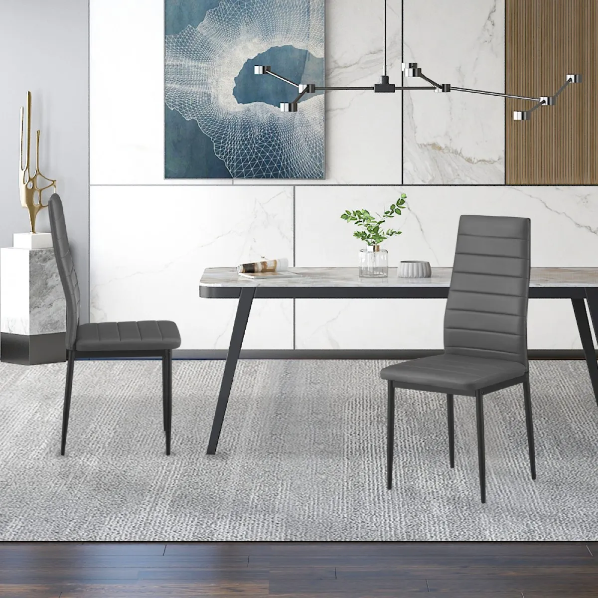 Sublimez votre salle à manger moderne ou votre cuisine moderne en optant pour une chaise moderne grise en PU. Nous vous proposons la chaise moderne salle à manger en PU OSKAR ou chaise moderne de cuisine. La chaise grise en PU se veut pratique pour le nettoyage avec sa matière pratique pour le nettoyage et de son pied en métal noir. Il vous sera possible de l'utiliser en chaise de cuisine moderne au sein de votre intérieur. Pour un ensemble harmonieux, nous vous conseillons d'opter pour une belle table à manger moderne en bois ou table à manger moderne en céramique.
