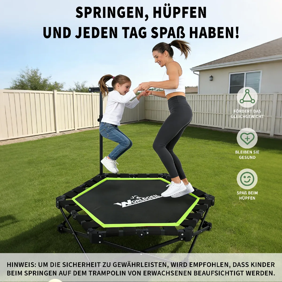 Trampoline d'intérieur pliable - ce trampoline d'intérieur pour enfants est pré-assemblé à 95 % et il suffit de fixer la barre de maintien avant la première utilisation. Une fois plié, ce trampoline de fitness est compact (25 × 25 × 79 cm) et se déplace facilement en le poussant ou en le soulevant. Vous pouvez ainsi l'installer dans un coin de votre maison, sur un balcon, dans le jardin, au-dessus d'un lit pliant ou dans le coffre de votre voiture. Vous pouvez ainsi commencer votre entraînement n'importe où et n'importe quand. Il se range également facilement sous un lit, un canapé ou à côté d'une armoire, ce qui le rend idéal pour les appartements et les petits logements.barre de maintien réglable sur trois niveaux - la barre de maintien offre trois hauteurs différentes : 103 cm, 108 cm et 113 cm. Elle s'adapte à toutes les tailles et à tous les styles d'entraînement. Sa surface est recouverte de mousse antidérapante pour une prise en main confortable et sûre, même avec les mains moites. La barre de maintien est amovible pour plus de liberté de mouvement. Ce trampoline convient aussi bien aux adultes qu'aux adolescents.structure triangulaire stable - l'ensemble du cadre est fabriqué en acier haute résistance et utilise un mécanisme triangulaire stable qui répartit la force uniformément et réduit les risques de vacillement ou de glissement pendant les sauts. Les pieds reposent fermement au sol et empêchent tout glissement, même lors d'entraînements prolongés. Sa capacité de charge maximale de 150 kg le rend adapté à différentes intensités d'entraînement.tapis de saut ultra-résistant à l'abrasion - le tapis de saut est fabriqué en polypropylène (pp) ultra-résistant à l'abrasion et possède des bords multicouches et des coutures renforcées pour minimiser l'usure lors d'un usage intensif. La construction renforcée des bords garantit que le tapis reste plat, stable et conserve sa forme même après de nombreux sauts. Il ne se détend pas et ne se déchire pas facilement, ce qui le rend idéal pour une utilisation régulière et intensive.un entraînement complet et facile - seulement 5 à 10 minutes d'entraînement par jour suffisent pour activer de nombreux groupes musculaires tels que les jambes, les fessiers et les abdominaux, favoriser la circulation sanguine, améliorer l'équilibre et contribuer à la combustion des calories. Idéal pour le cardio, les exercices d'équilibre et les séances d'entraînement à domicile – parfait pour tous ceux qui souhaitent intégrer l'exercice physique à leur quotidien chargé.service client – il s'engage à fabriquer des équipements de fitness durables et de haute qualité. Pour toute question lors de l'utilisation, nous sommes à votre disposition. Nous disposons d'un stock suffisant de pièces détachées et d'accessoires afin de garantir le parfait fonctionnement de votre équipement pour de nombreuses années.