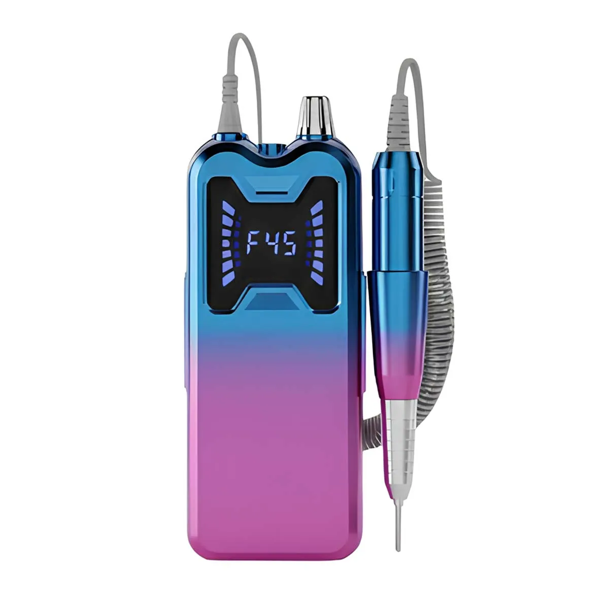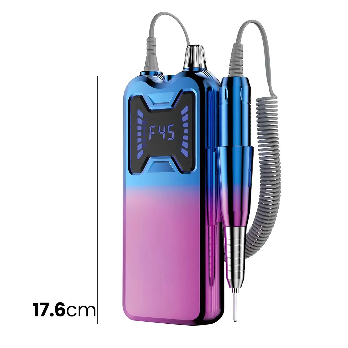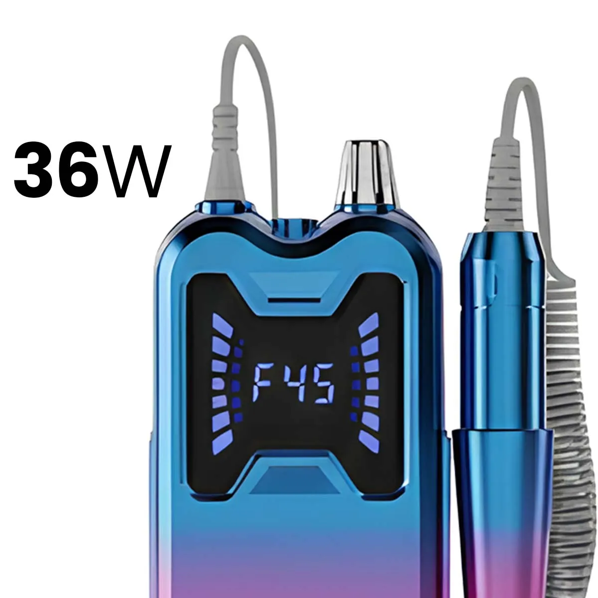 Cette ponceuse à ongles rechargeable développe une puissance de 36W et fonctionne avec une vitesse unique réglable en continu jusqu'à 45 000 tours par minute. Un écran LED intégré affiche le niveau de fonctionnement. L'appareil fonctionne sur batterie interne rechargeable pour une utilisation sans fil. Le corps est conçu en ABS avec une poignée en aluminium. Six embouts métalliques interchangeables sont fournis.