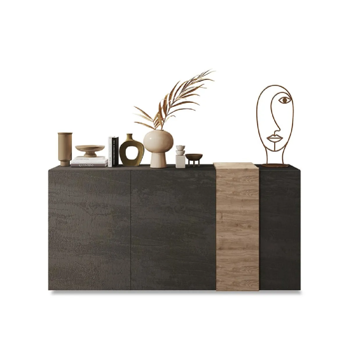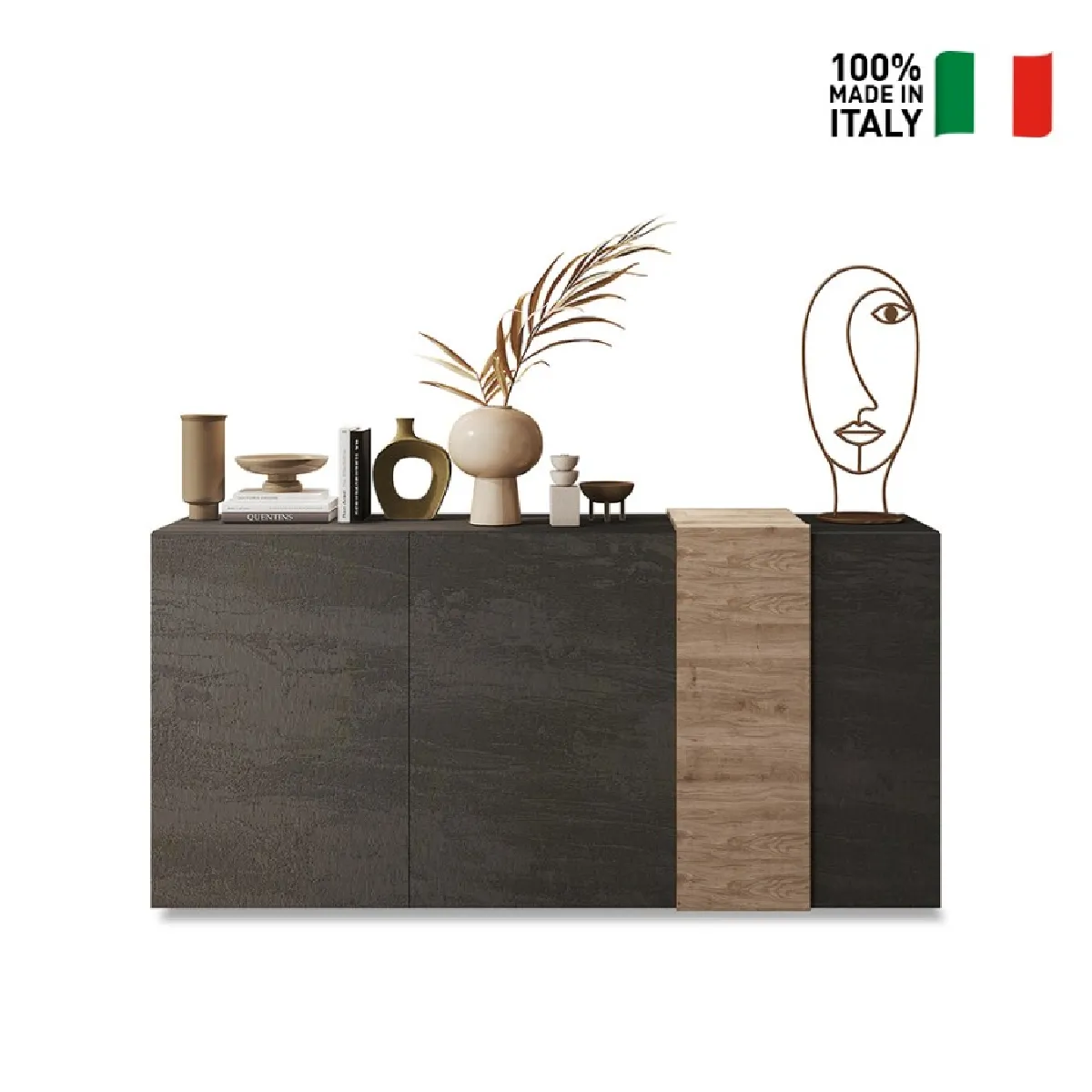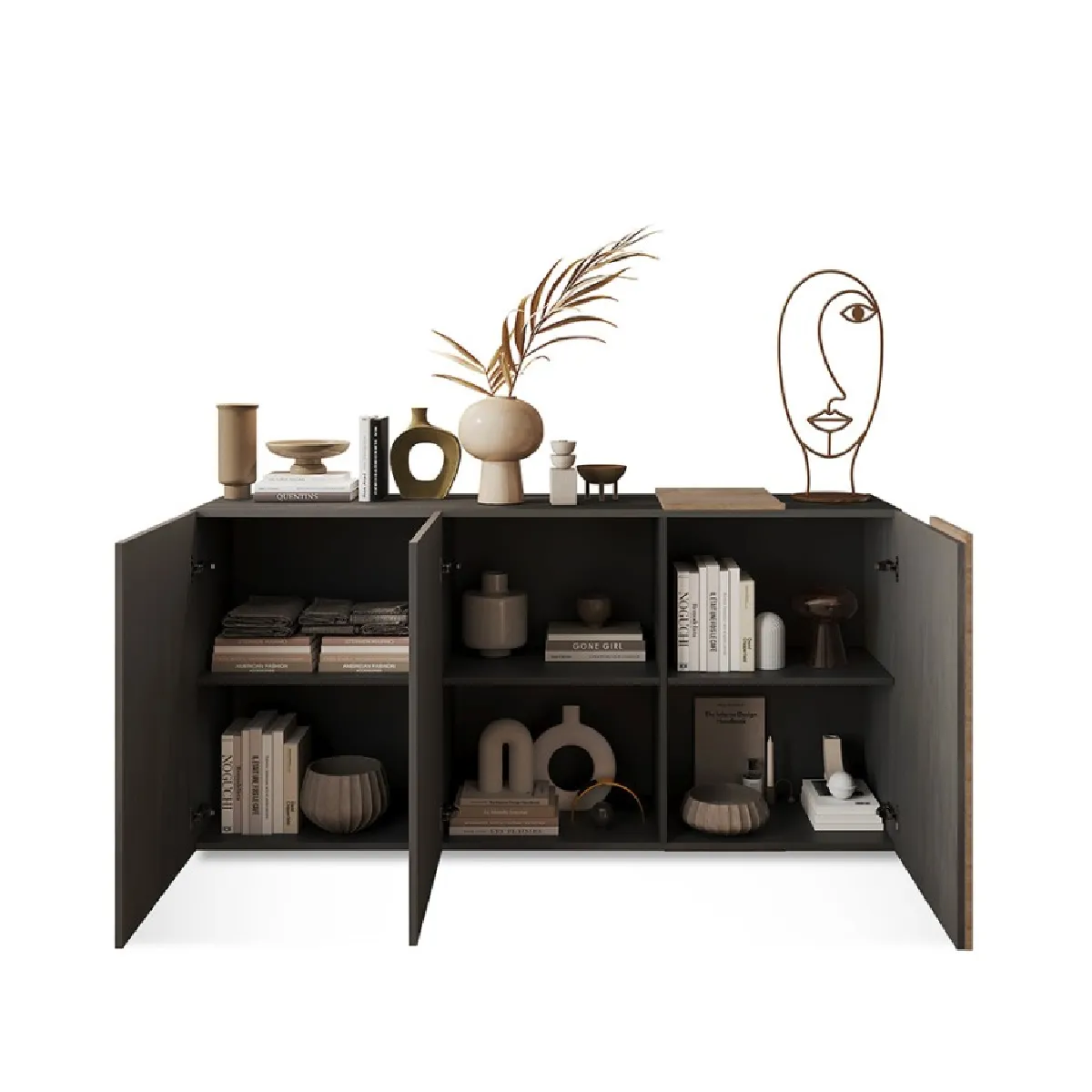 Grâce aux nombreux espaces disponibles, Byron est le buffet parfait pour meubler votre espace de vie de manière ordonnée, fonctionnelle et surtout plus élégante. Il est fabriqué avec des matériaux garantis 100% Made in Italy et est équipé de 3 portes battantes. Vous pouvez conserver tout ce que vous souhaitez de manière précise et à l'abri de la poussière, comme la vaisselle, les couverts, les nappes, les livres de recettes, les ustensiles de cuisine, les accessoires pour la maison et bien plus encore. La finition particulière en titane gris contraste avec la large bande en bois disponible en 2 nuances de couleur et qui sert également de poignée pratique. Vous aimez son design ? Jetez un il aux autres meubles de la collection Venus présents dans notre catalogue.
