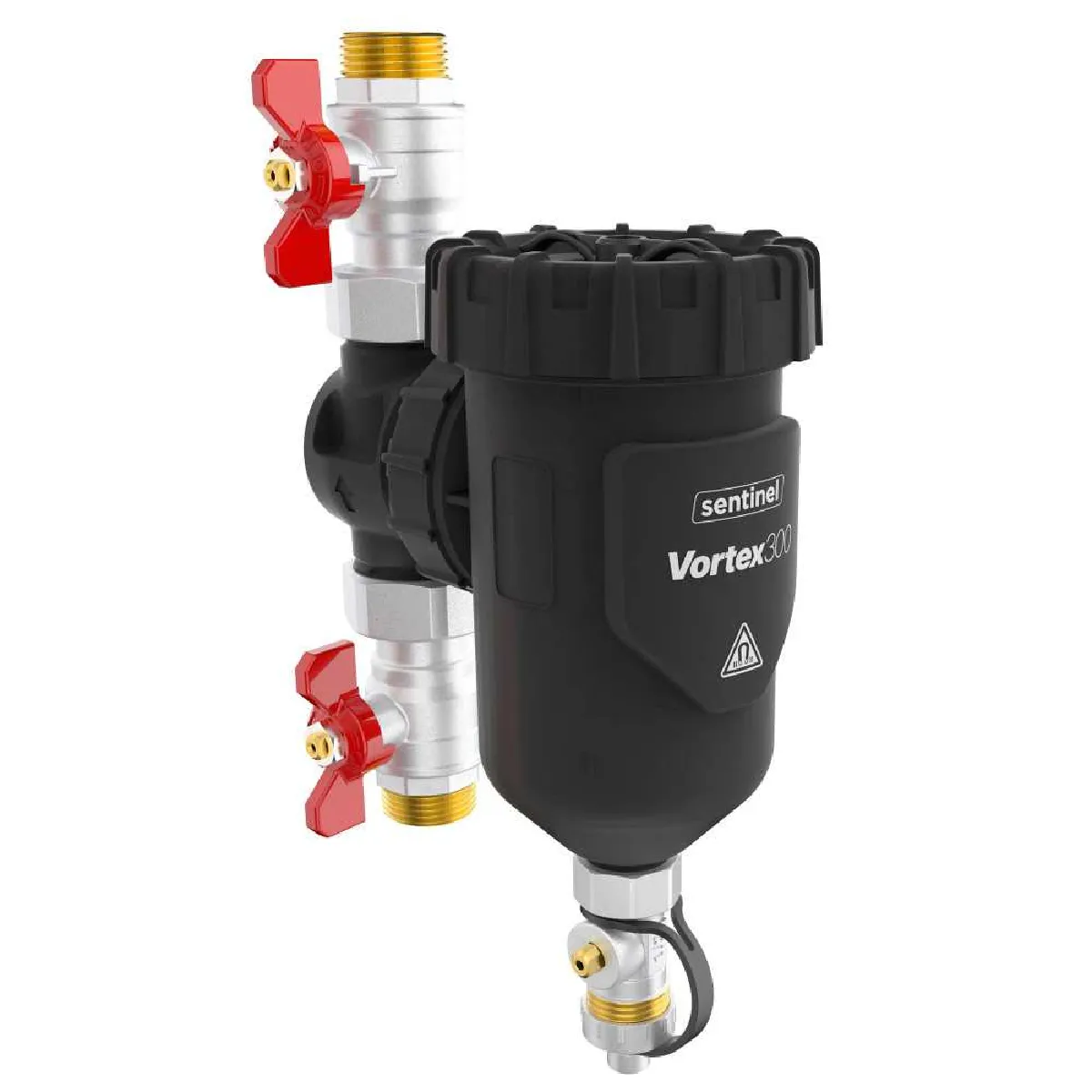 Le Vortex300 est un filtre à boues magnétique conçu pour protéger les chaudières et circuits d'eau de chauffage en capturant efficacement particules et boues. Compact, il s'adapte aux espaces restreints sous chaudières murales et se monte verticalement pour que la prise de vidange soit au point le plus bas. Le boîtier est en plastique noir avec marquages visibles "Vortex300" et le logo Sentinel.
