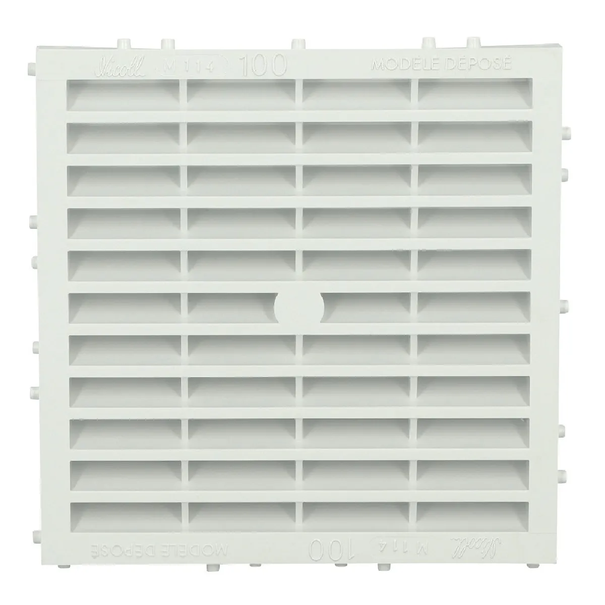 La grille façade Nicoll référence M214 (marquage produit M114 embossé) est une grille d'aération carrée destinée à créer une entrée d'air verticale pour maisons individuelles. Fabriquée en France en plastique blanc mat, elle est fournie avec une moustiquaire intégrée pour limiter l'intrusion d'insectes.