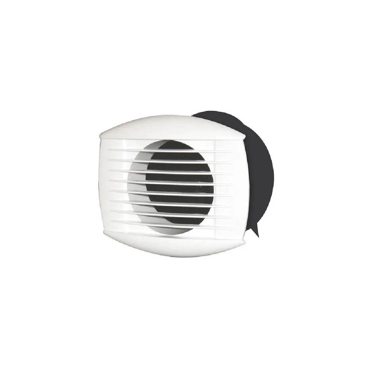 La face avant présente des ouvertures visibles avec des slats horizontaux, associées à un capot frontal bombé et à un cadre en plastique blanc. L'ensemble offre un rendu propre et homogène, pensé pour une installation soignée.