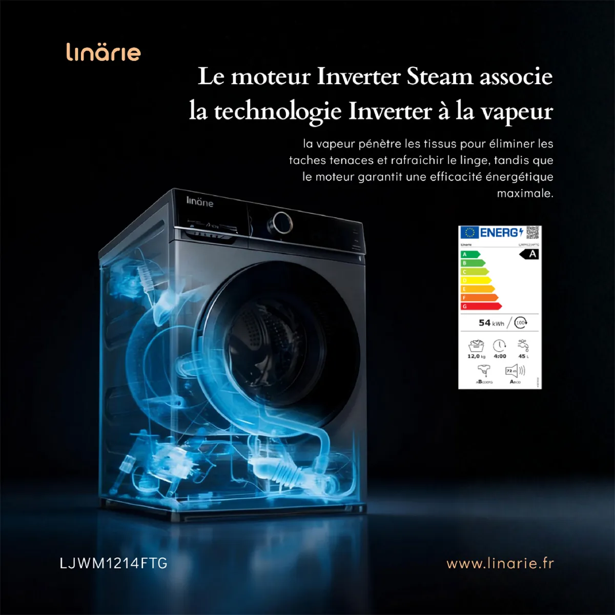 LINARIE Lave-linge hublot LJWM1214FTG Gris 12kg 1400 tours moteur Direct Drive 14 programmes |