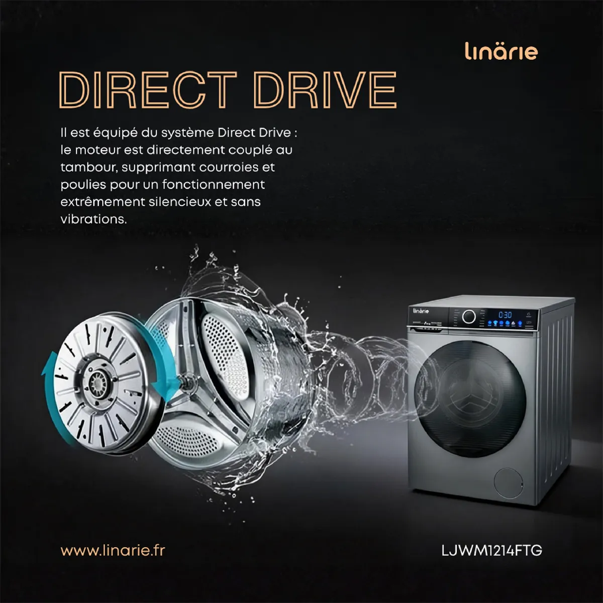 LINARIE Lave-linge hublot LJWM1214FTG Gris 12kg 1400 tours moteur Direct Drive 14 programmes