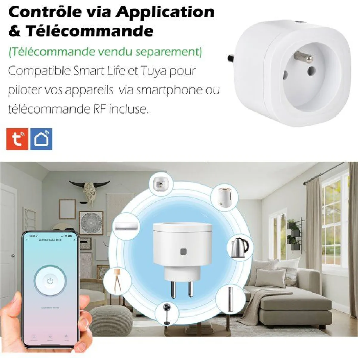 KYF prise connectée compacte intérieure 3680W – Wi-Fi 2,4 GHz + RF 433 MHz, blanche