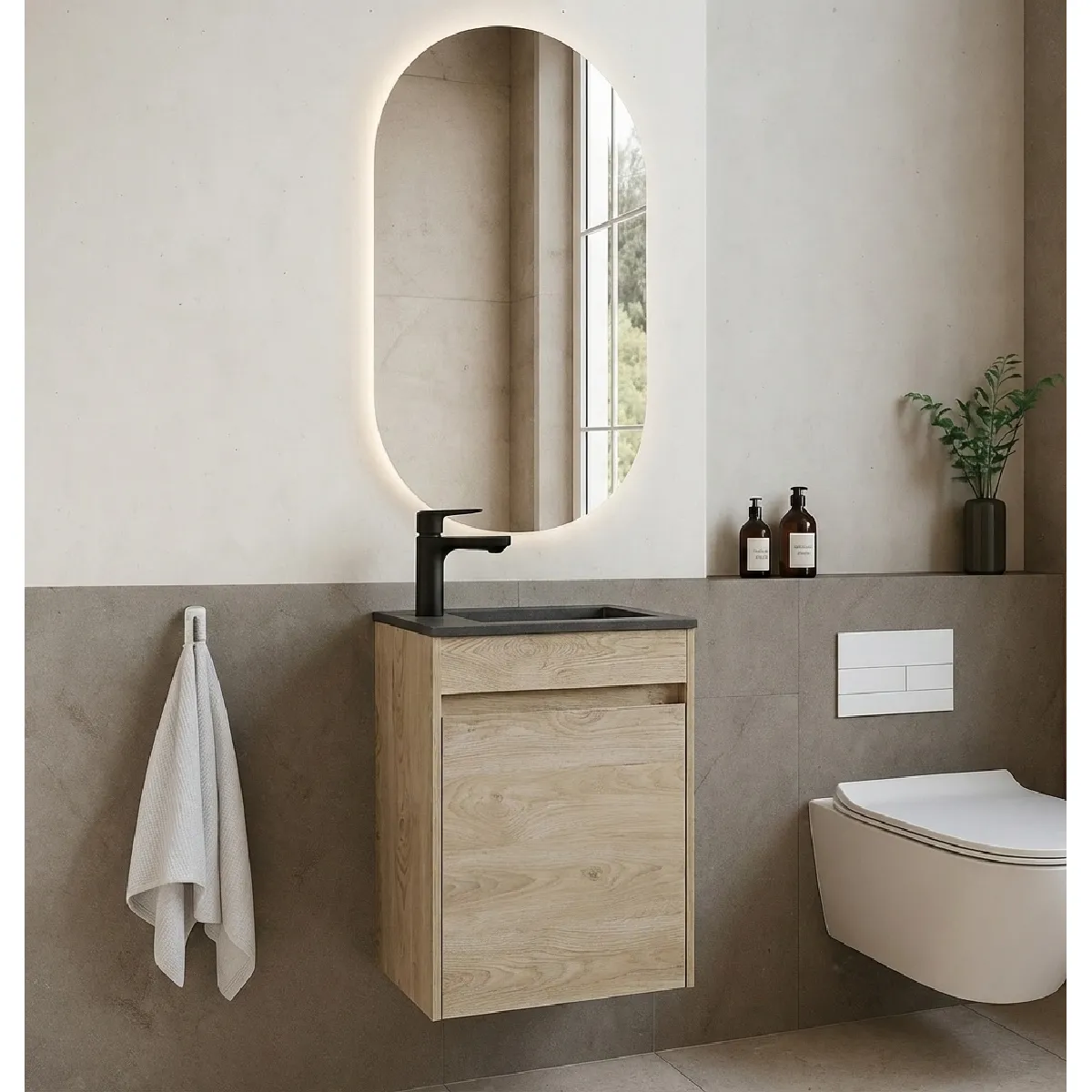 - Meuble de toilette complet avec meuble sous lavabo et lavabo noir.