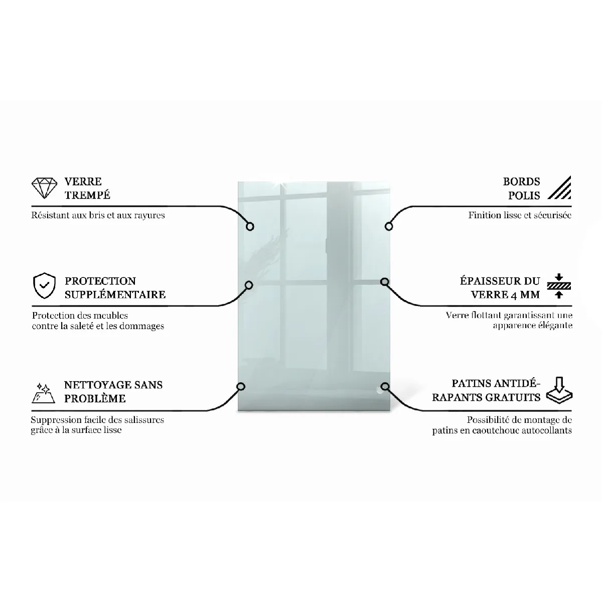 - Matériau : Verre trempé Float (4 mm)