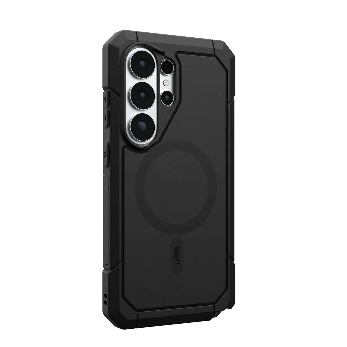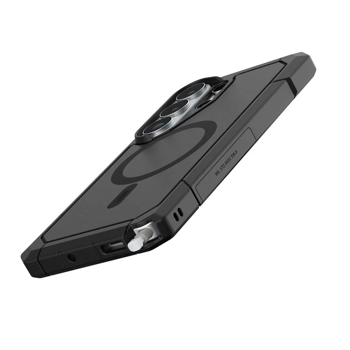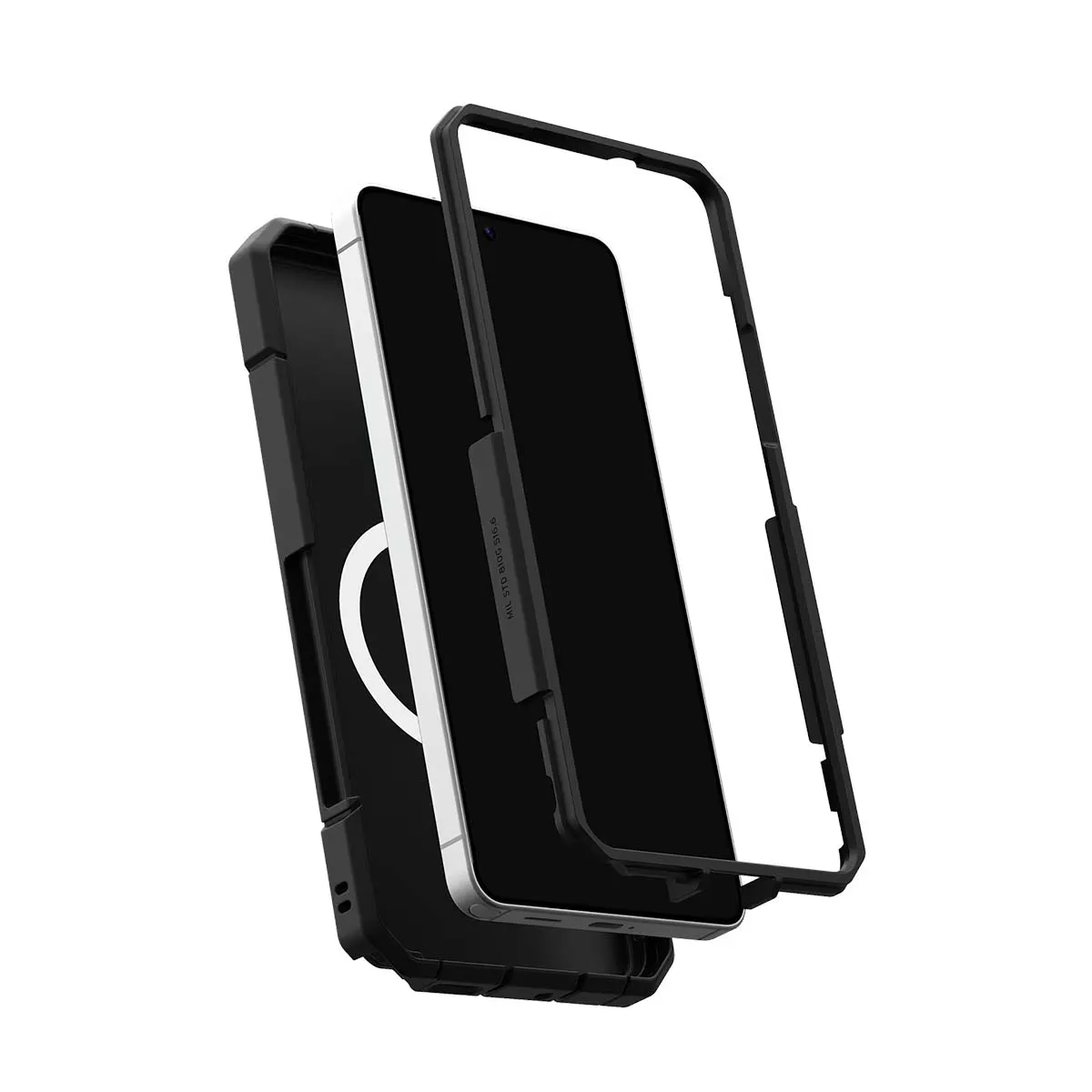 Cette coque noire pour Galaxy S26 Ultra associe une construction co-moulée avec dos rigide et noyau souple absorbant les impacts. Le cadre renforcé et les coins biseautés répartissent les chocs. La conception en deux parties améliore la rigidité globale. Le module magnétique intégré permet l'utilisation avec accessoires compatibles. La structure permet une protection contre les chutes jusqu'à 9,1 mètres.