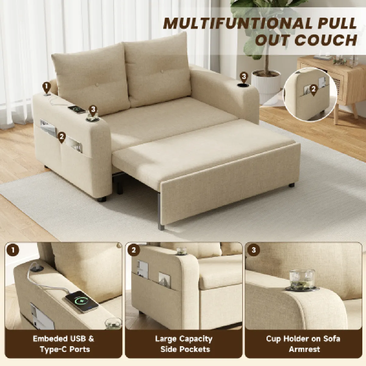 Merax Canapé-lit 3 En 1, Convertible En Lit-coussins Et Port USB-beige