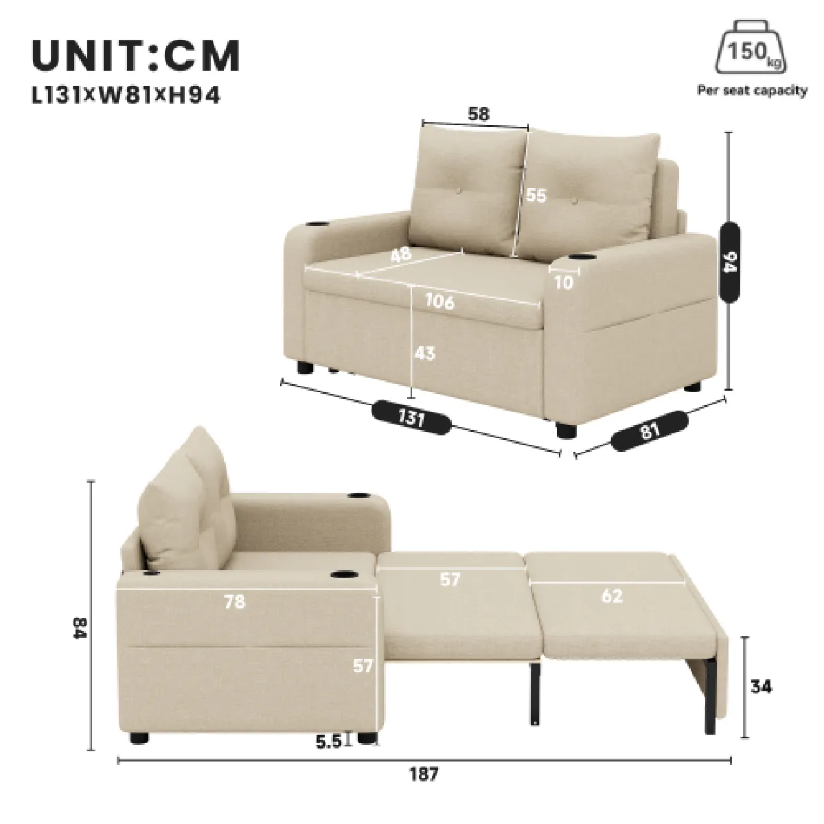 Dimensions flexibles : plié, le canapé mesure 131 x 81 x 94 cm et s'intègre facilement dans tous les salons. Déplié, il atteint une longueur de 187 cm, idéale pour un sommeil réparateur et un gain de place optimal.