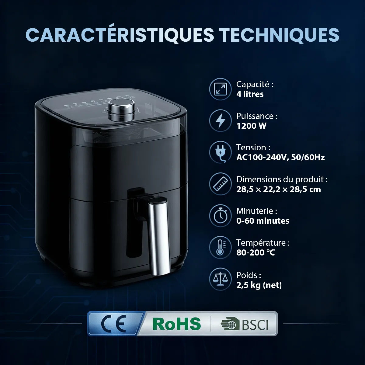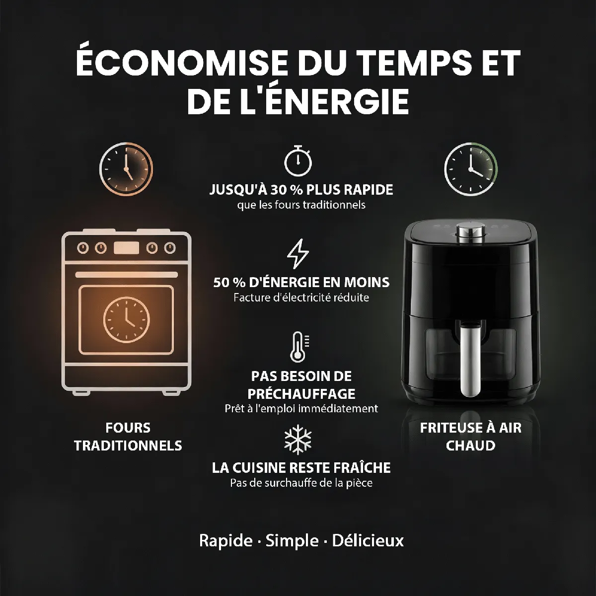 Fini les fritures grasses et caloriques ! Cette friteuse utilise uniquement de l'air chaud circulant à 360° pour cuisiner, réduisant drastiquement la consommation d'huile, pour des plats plus sains, sans compromis sur le goût. Parfaite pour une alimentation équilibrée, pour les enfants et les adultes.