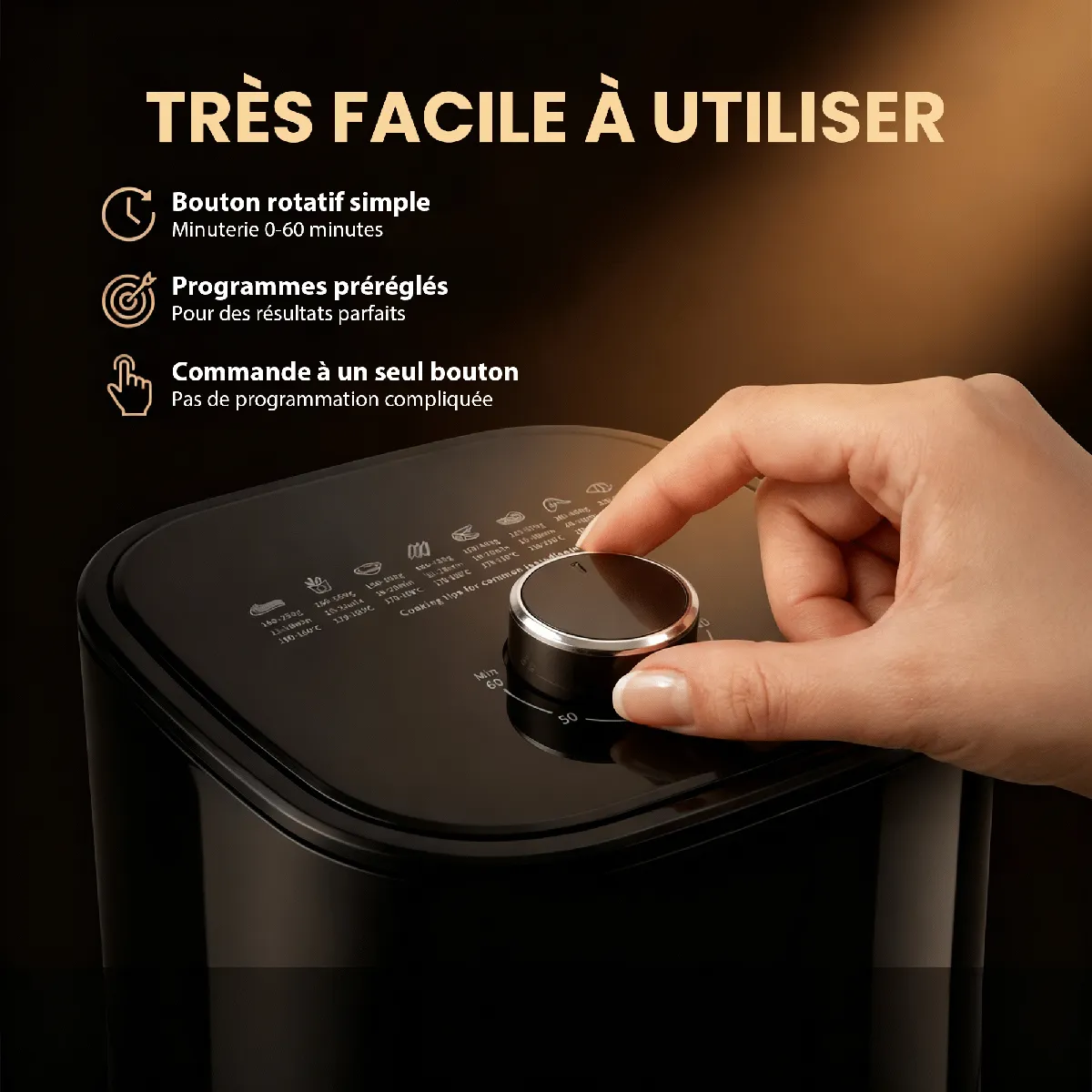 Le bouton rotatif simple et les programmes prédéfinis rendent la cuisine accessible à tous, même aux débutants. Réglez la minuterie de 1 à 60 minutes et la température de 80 à 200°C en un clic, pour une cuisson parfaite à chaque fois.