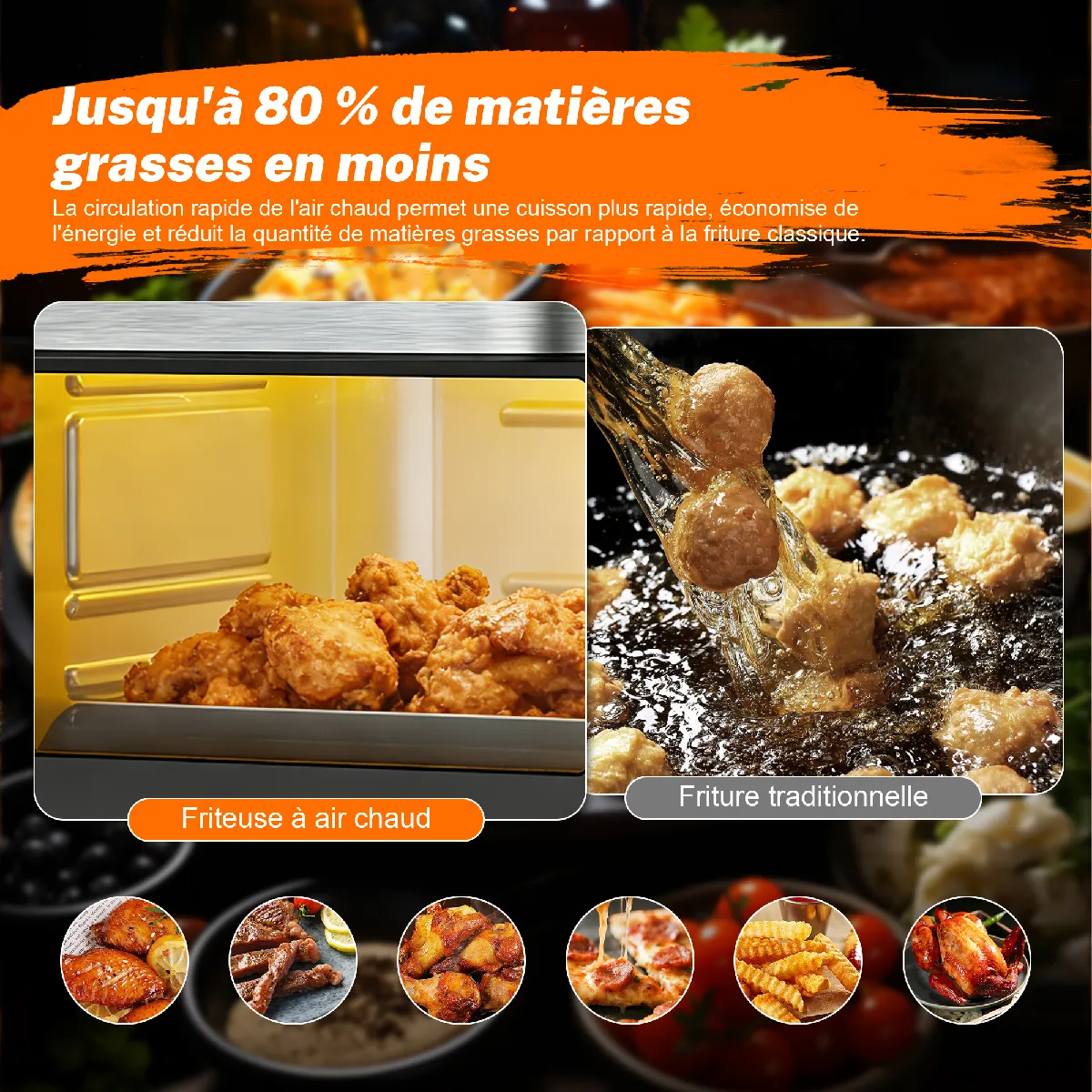 Fini les fritures grasses et caloriques ! Cette friteuse à air utilise uniquement de l'air chaud pour cuisiner, réduisant drastiquement la consommation d'huile et de graisse, pour des plats plus sains, sans compromis sur le goût. Parfaite pour une alimentation équilibrée, pour les enfants et les adultes.