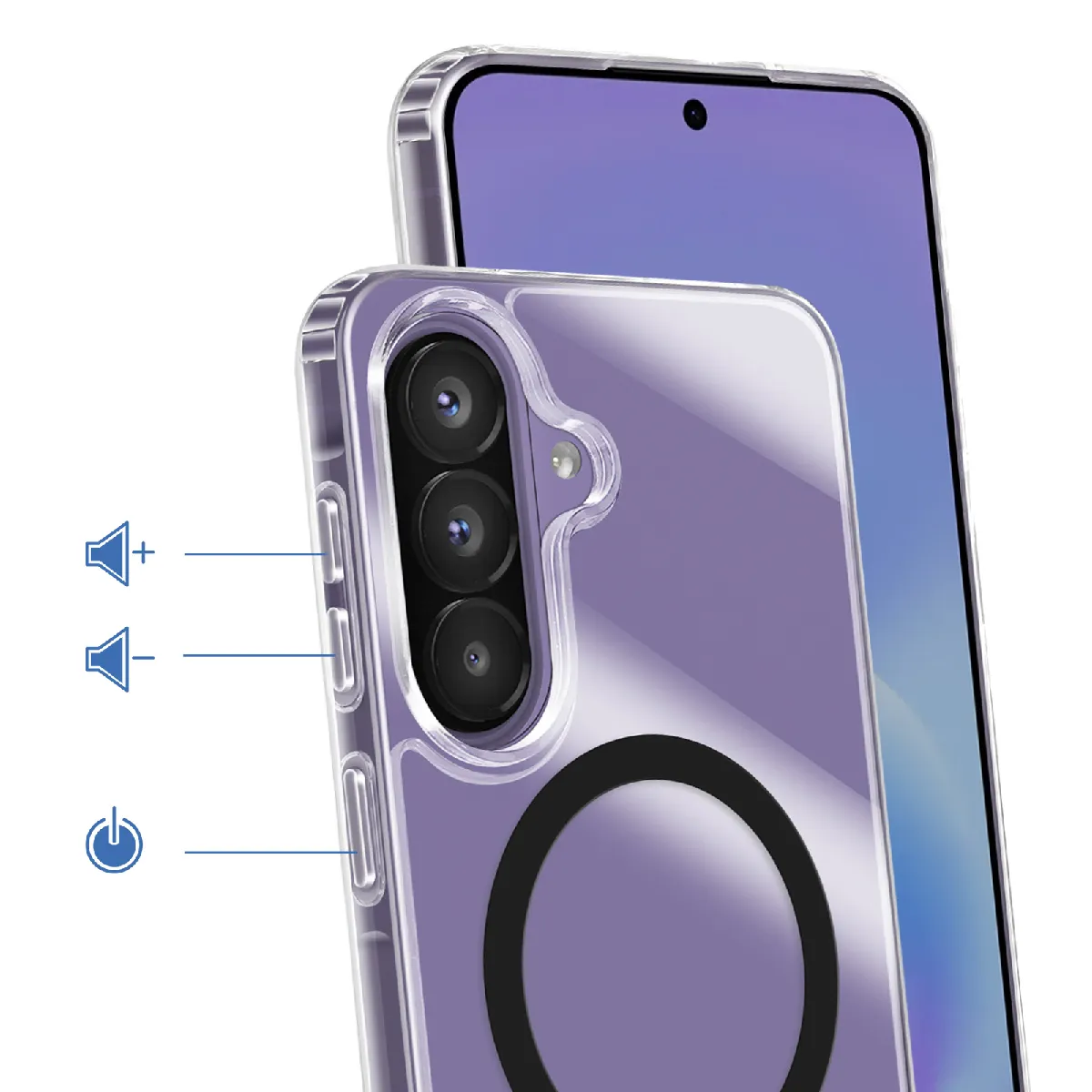 Coque MagSafe transparente conçue pour protéger le Samsung Galaxy A57 sans masquer son design. Sa structure bi-matière en polycarbonate et silicone gel avec coussins d'air absorbe mieux les chocs du quotidien. L'anneau magnétique noir reste compatible avec les accessoires MagSafe, supports et porte-cartes, tandis que les bords surélevés sécurisent l'écran et la caméra même sur une surface plane au quotidien.