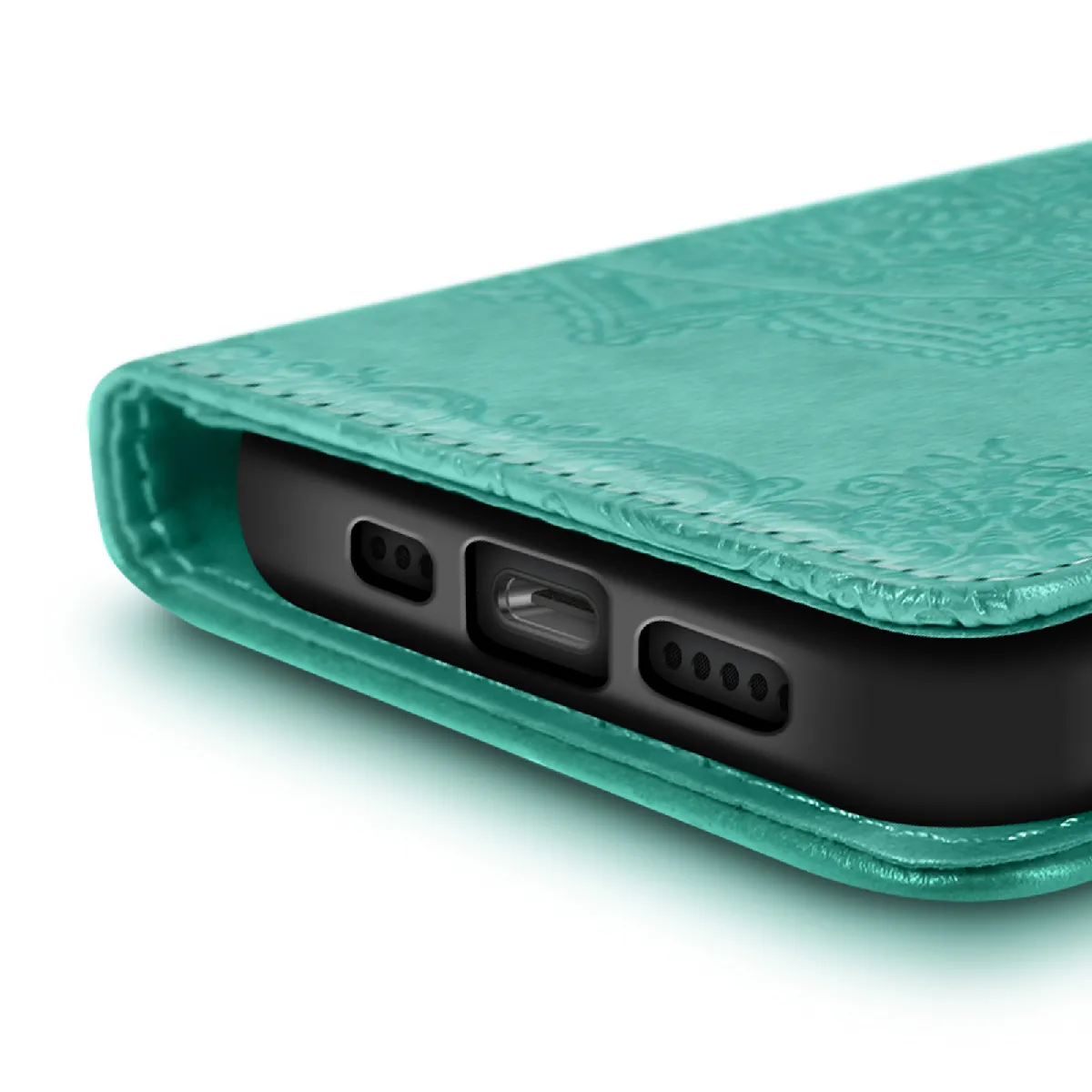 Avizar Étui Portefeuille pour iPhone 17e Série Mandala avec Support Vidéo et Dragonne Vert |