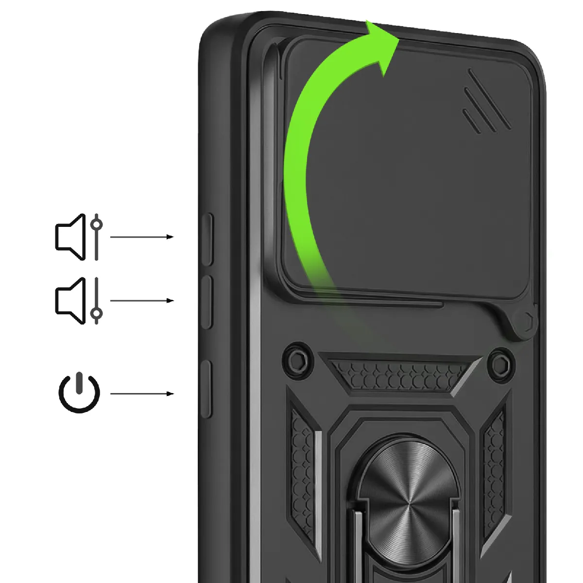 Cette coque antichoc offre une protection avancée pour votre Redmi Note 15 4G grâce à sa structure renforcée absorbant efficacement les impacts. Son cache caméra coulissant protège les objectifs des rayures au quotidien. La bague rotative intégrée améliore la prise en main et permet un usage en mode support. Compatible avec les supports magnétiques, elle allie sécurité, praticité et confort d'utilisation.