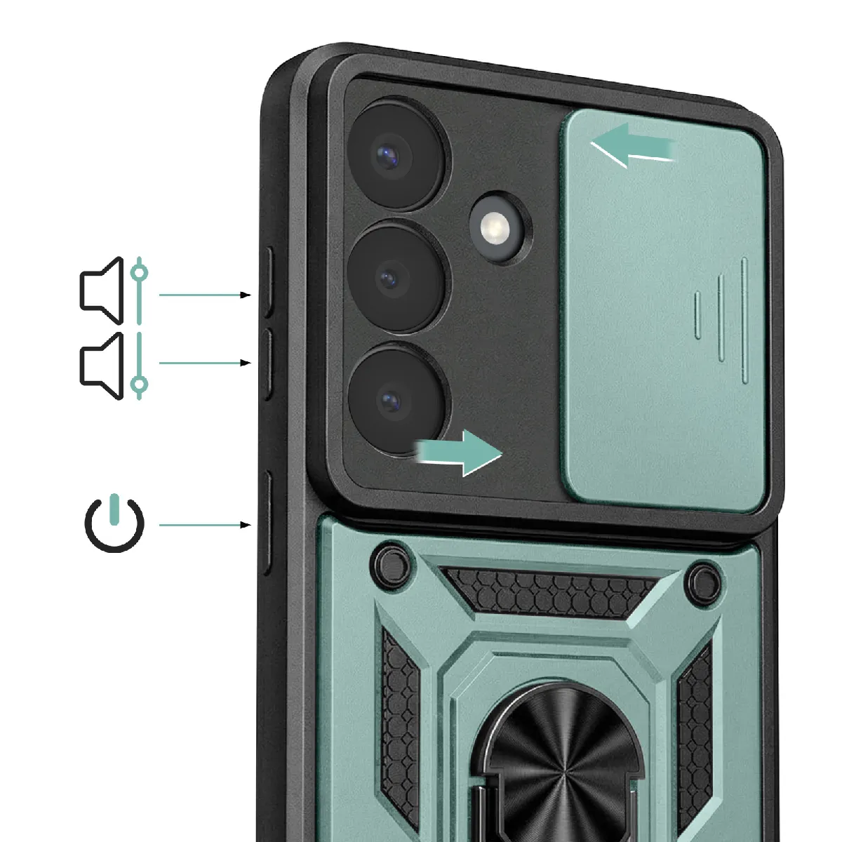 Cette coque antichoc pour Galaxy S26 Plus offre une protection renforcée certifiée norme militaire MIL-STD-810G. Elle absorbe efficacement les chocs et protège contre les rayures. Son cache caméra coulissant évite les dommages aux objectifs, tandis que la bague rotative intégrée assure une bonne prise en main et sert aussi de support vidéo. Ainsi, une plaque métal compatible support magnétique est intégrée.