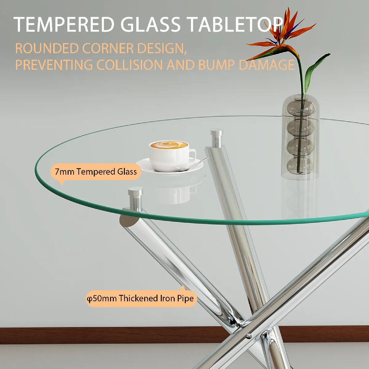 Le plateau est en verre trempé de 7mm d’épaisseur, avec des bords arrondis polis pour une sécurité maximale (résistant aux chocs et à la casse). Il offre un reflet clair et transparent, agrandit visuellement votre espace et s’accorde avec tous vos meubles.