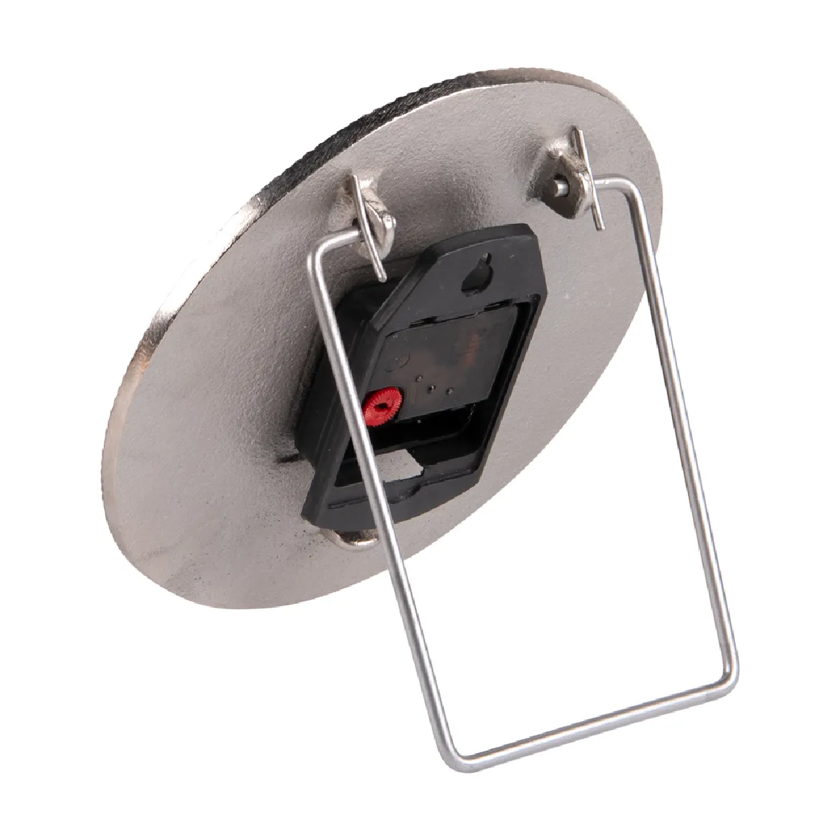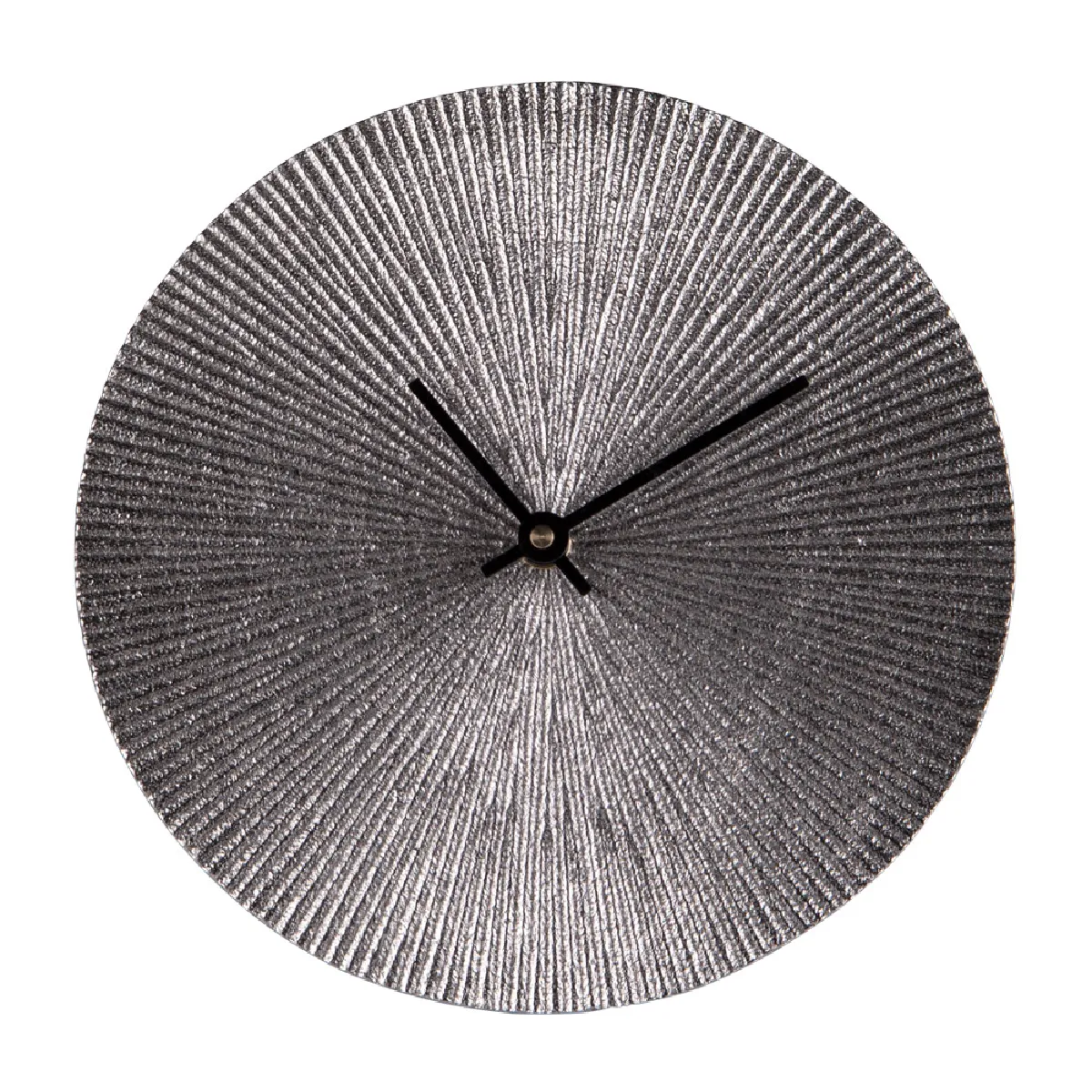Horloge décorative ronde Ø20 cm en métal finition argentée, design ' soleil ' avec relief rayonnant et aiguilles noires. Piètement en U intégré pour pose sur meuble ou table de chevet. Produit léger, facile à présenter en catalogue et à valoriser en visuel grâce à son rendu texturé et ses reflets métalliques. Article adapté aux gammes déco contemporaines et aux petites idées cadeau. Prix unitaire.