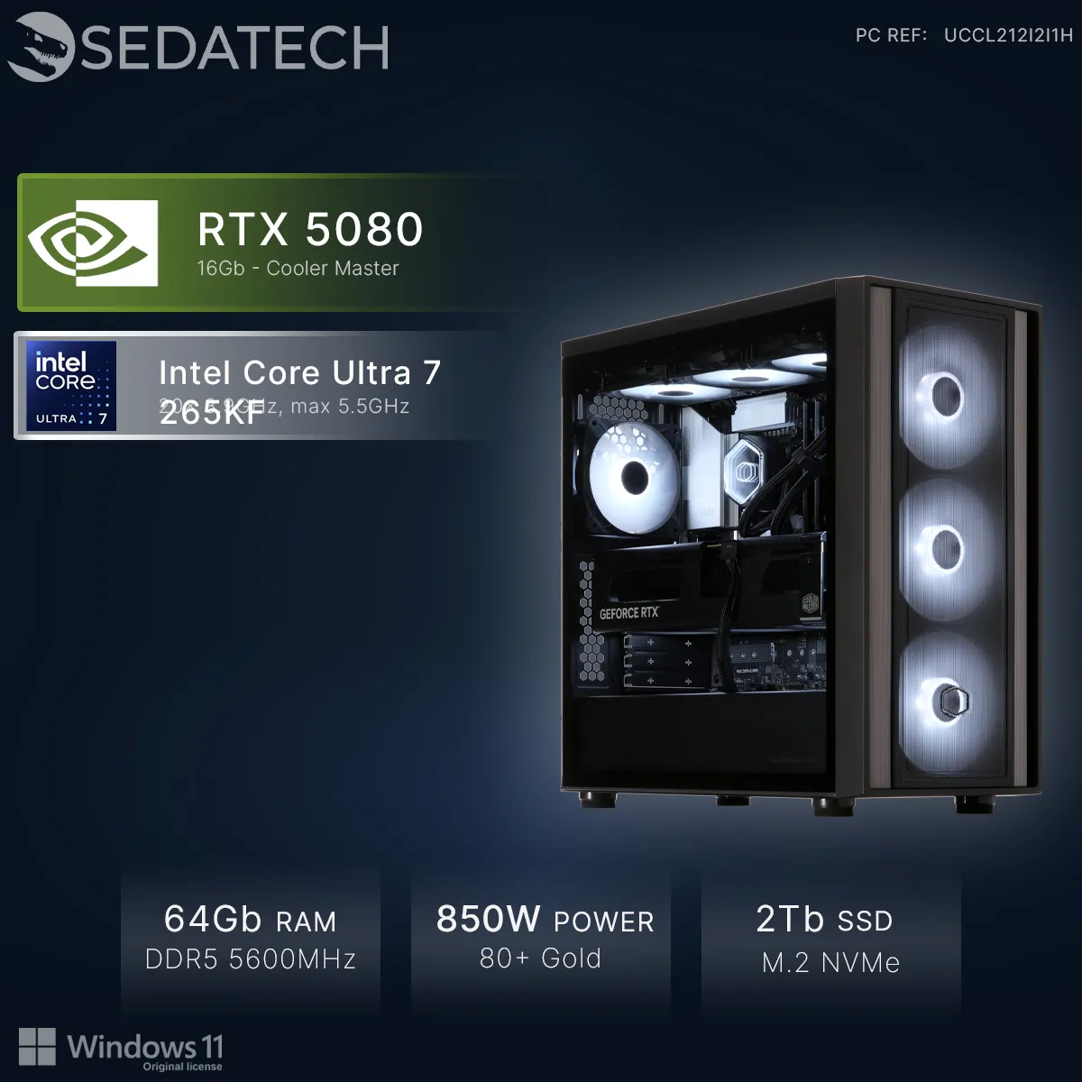 Sedatech PC Gamer, Core Ultra 7 265KF, RTX5080, 64Go DDR5, 2To SSD, Win 11 |