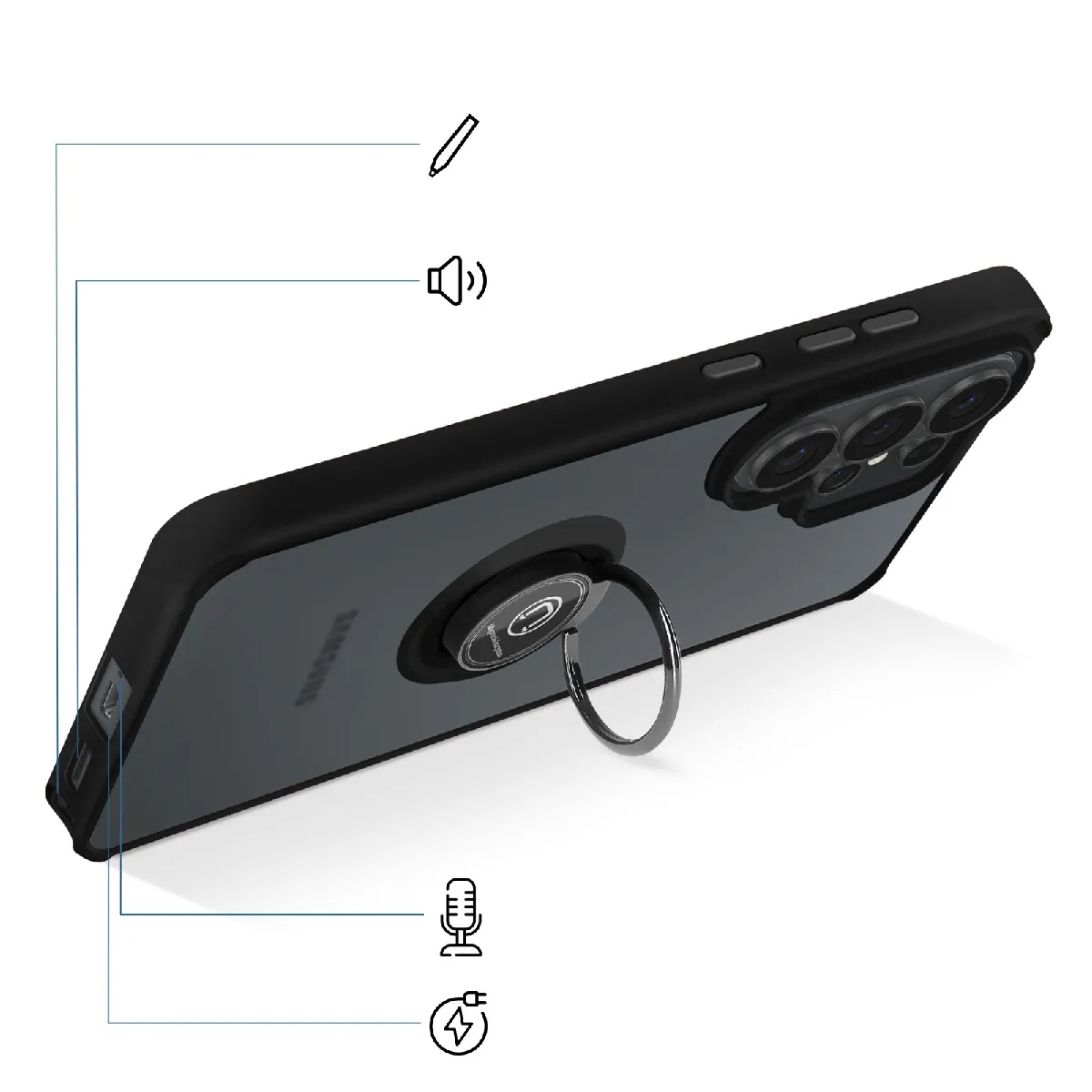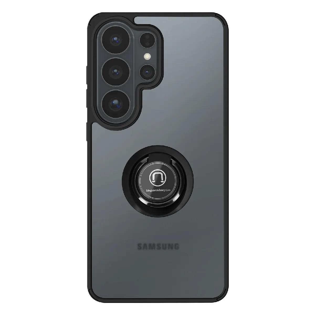 Cette coque pour Galaxy S26 Ultra combine un dos rigide givré en polycarbonate transparent et une bordure noir en TPU à absorption d'impact. L'anneau métallique arrière, rotatif à 360°, intègre un insert ferromagnétique compatible avec les supports magnétiques de voiture. Le rebord surélevé protège le module photo, tandis que l'anneau sert aussi de support stable pour vidéos et appels visio.