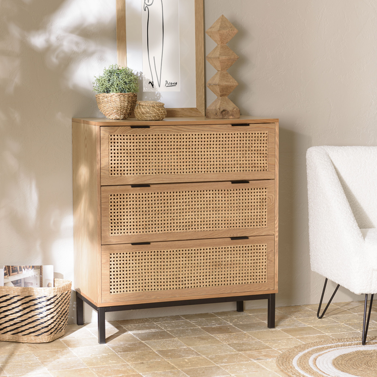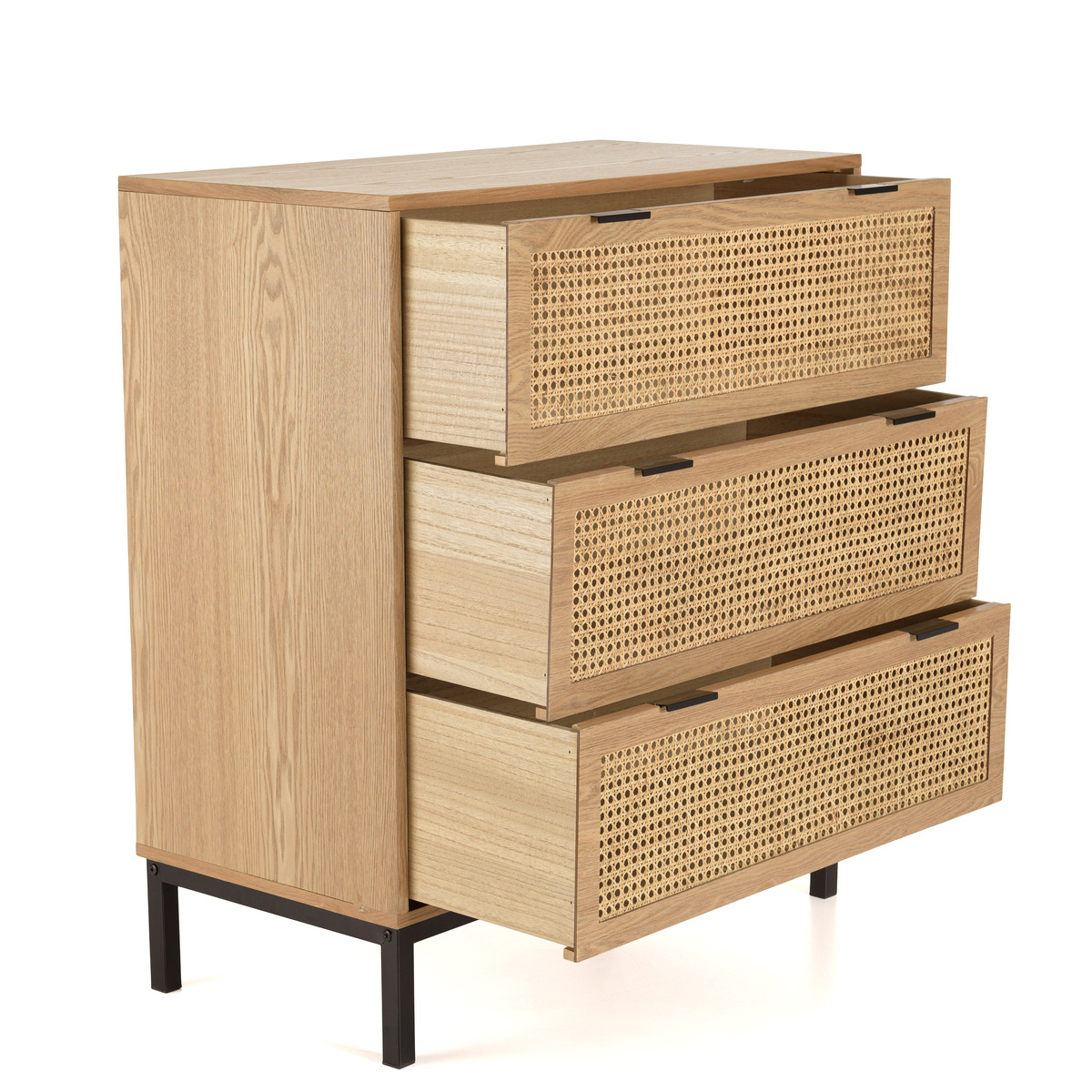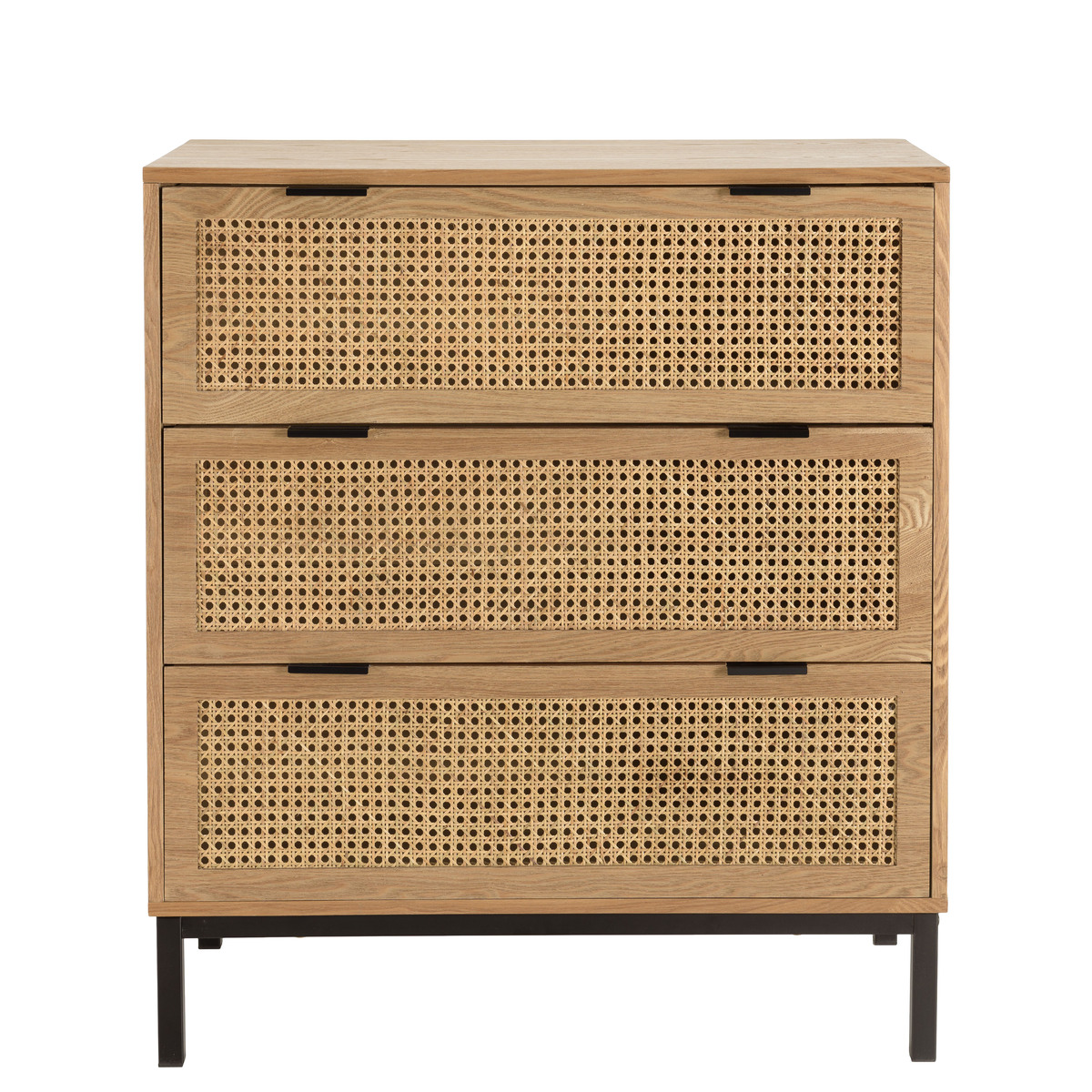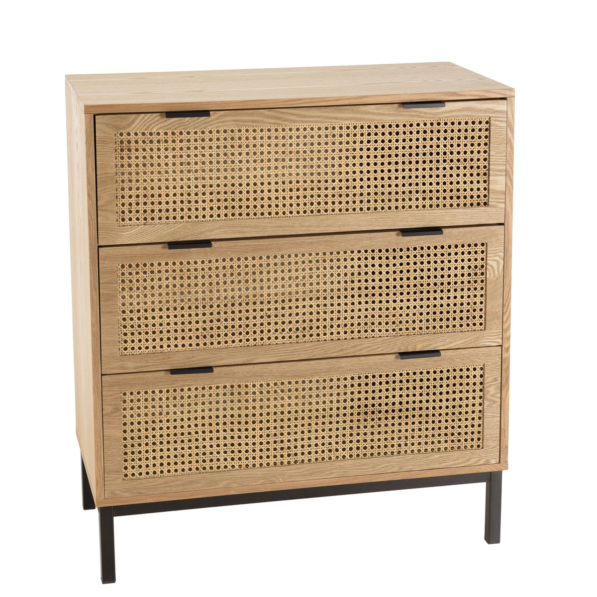 Commode 3 tiroirs cannage naturel pieds métal noir MARCEAU