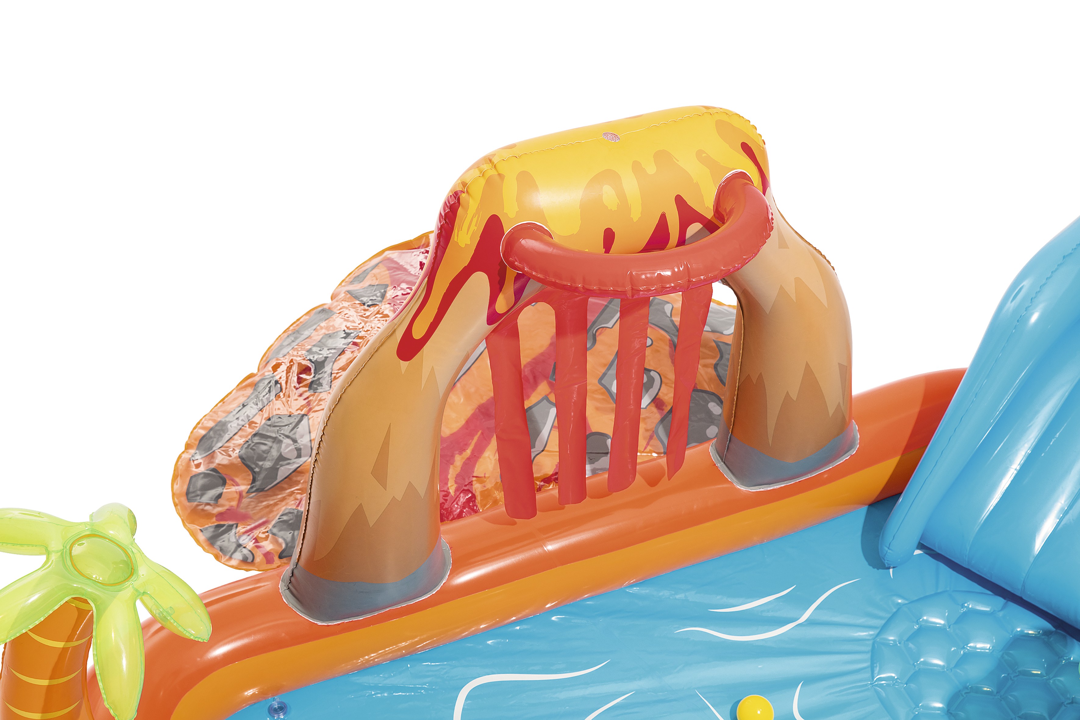 - L'aire de jeu comprend un toboggan amovible, un coussin gonflable détachable et un jet d'eau avec raccordement au tuyau d'arrosage.