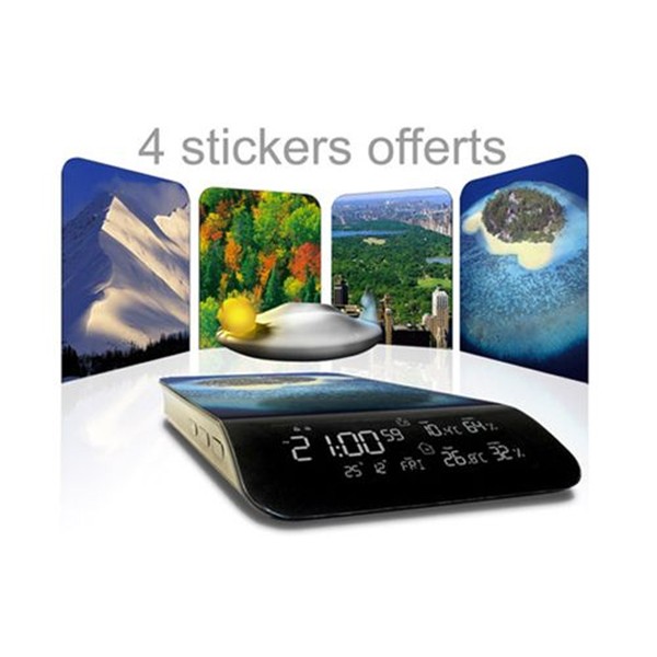 Commentaire vendeur : PING vous propose : la 3DStation, Une station météo unique en son genre qui permet d'observer les prévisions météo à 24h/48h par capteur de pression barométrique. Cet impressionnant Nuage Interactif qui lévite a 15 mm au dessus de la base, vous indique la météo par un système d'éclairage : jaune : ensoleillé, blanc : nuageux et bleu : précipitations (pluie, nuage ...). Cette station météo technologique indique la température et hygrométrie environnantes et extérieures, horloge (heure 12h/24H), calendrier, alarme, affichage de la date (jour de la semaine en 5 langues). Elle fonctionne avec un adaptateur secteur 15v – 1A/220V. Cette station météo est une Création Française. PING vous explique : La lévitation du globe se fonde sur le principe d'induction électromagnétique. Un champ électromagnétique est généré par le courant électrique au niveau du socle. Ce champ magnétique repousse et stabilise ainsi l'aimant à 15 mm de hauteur et illumine les formes en fonction des indications données par le capteur de pression opérationnel inclus. Les plus d
