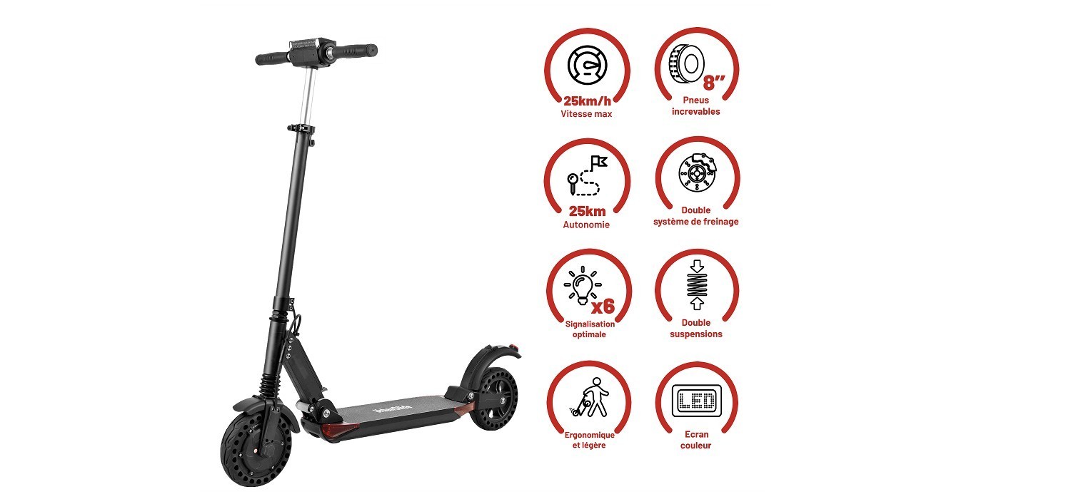 Trottinette électrique - Vmax 25 km/h - Autonomie 30 km - Roues 8" / 20 cm - Temps de charge 4h