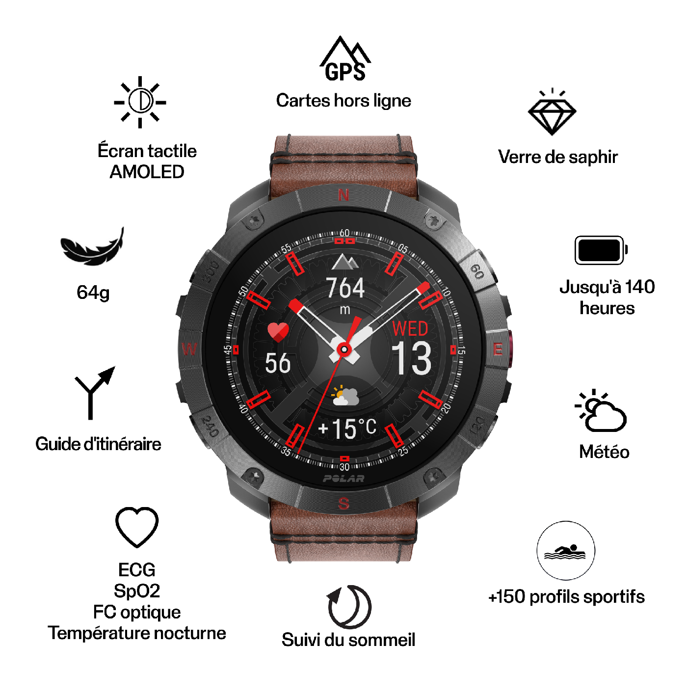 Montre Connectée Mixte POLAR 900110288 Grit X2 Pro Titan - Bracelet en cuir M-L marron |