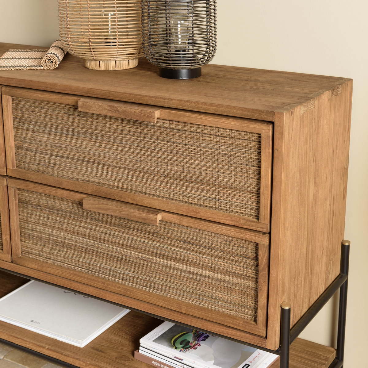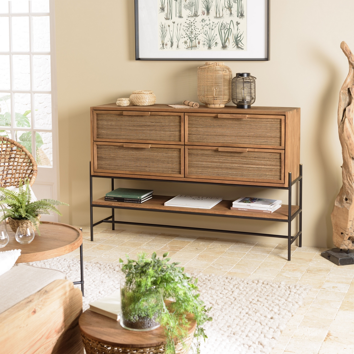 Imaginez ce joli buffet chez vous ! Avec quatre tiroirs et une étagère ouverte, ce meuble est très polyvalent dans son utilisation. Vous pourrez le disposer dans une entrée, un salon ou tout autre pièce de votre choix. Composé majoritairement de teck recyclé et de coco, il offre un style ethnique tendance.