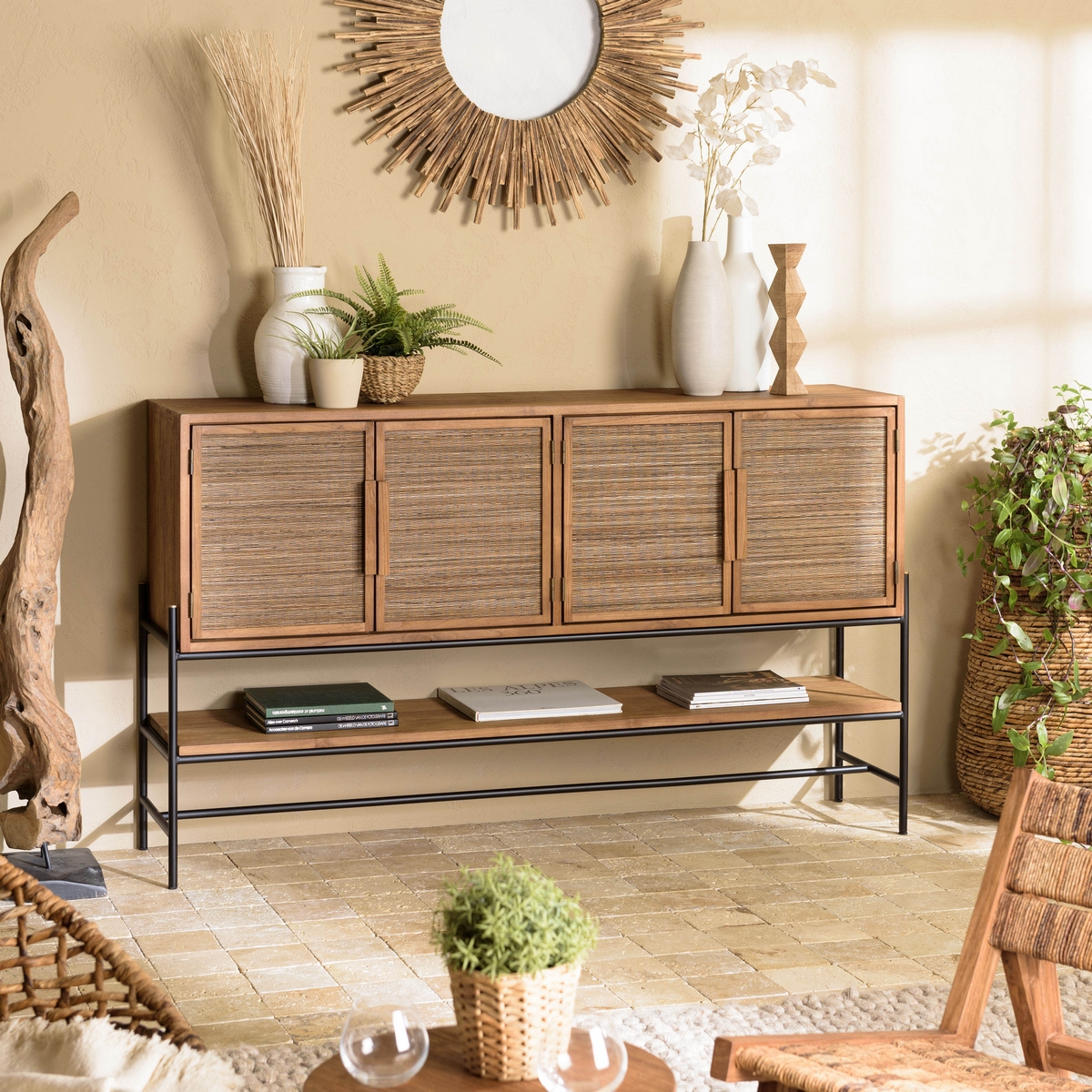 Optez pour ce buffet ethnique dans votre intérieur ! Ses quatre portes et sa niche sont idéals pour optimiser votre rangement. Dans une entrée, un salon ou tout autre pièce de votre choix, il trouvera sa place chez vous.Composé majoritairement de teck recyclé et de coco, ce grand buffet dégage une ambiance chaleureuse.