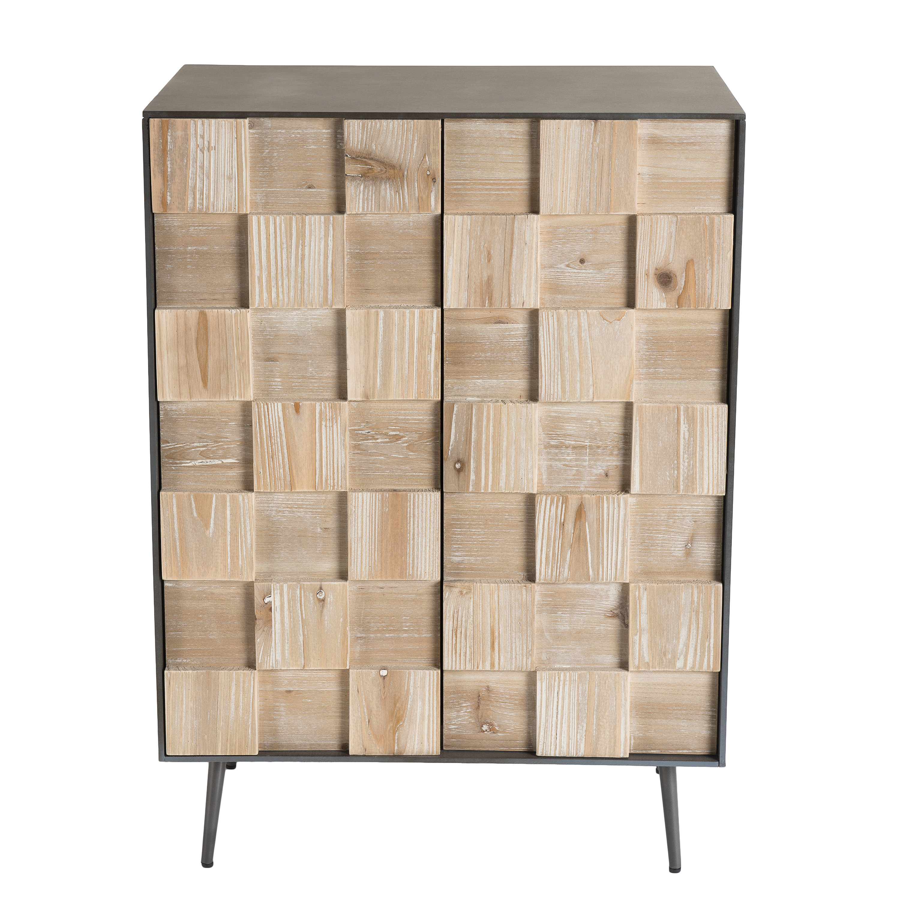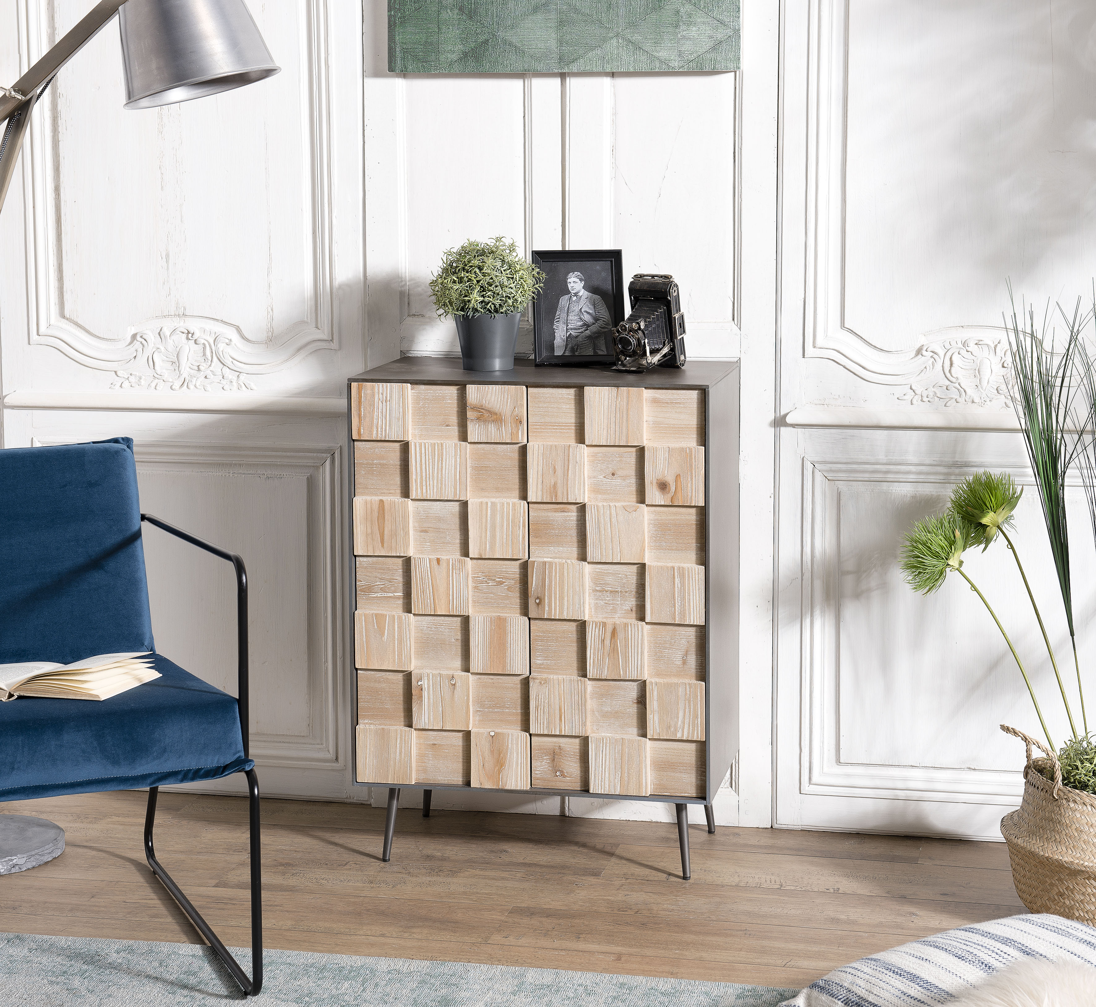 Laissez-vous séduire par ce Buffet 2 portes Sapin et pieds métal CARLA. Il s’adapte à vos besoins et à tous les styles de déco. Réalisé en bois de sapin, il apporte originalité et chaleur à la pièce. Les motifs marquetés sur la façade lui donnent un aspect moderne et élégant. Le tout repose sur des piétements en métal à la fois robustes et stables.