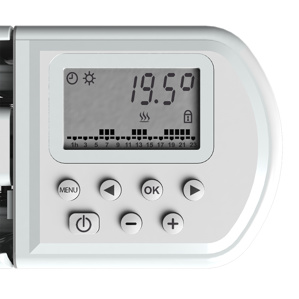- Fonctions: détection de fenêtre ouverte, consommation, absence prolongée, mise à l'heure automatique ou manuelle, verrouillage parental
