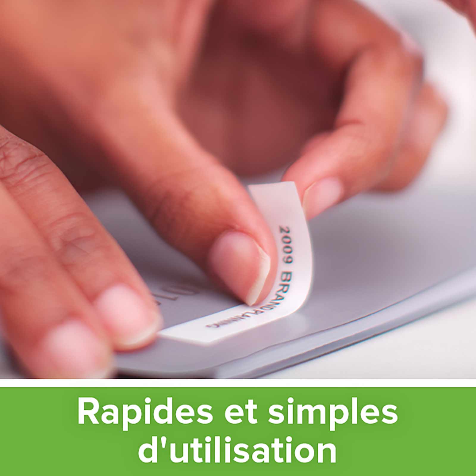 Ce modèle est disponible en plusieurs largeurs et coloris, ce qui vous permet de l'adapter à tout type de support et d'application. Conçu pour répondre aux exigences d'étiquetage en milieu professionnel, au bureau ou même dans des environnements plus rudes comme l’atelier, le DYMO Ruban D1 est parfait pour un étiquetage de qualité.