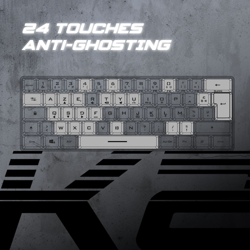 Avec ses 62 touches semi-mécaniques, le Pro K2 privilégie une frappe réactive et précise pour enchaîner les commandes sans hésitation. Dans les moments décisifs, la technologie anti-ghosting sur 26 touches enregistre fidèlement vos combinaisons, même lorsque plusieurs touches sont pressées simultanément. Sa construction solide et sa base antidérapante maintiennent le clavier stable, idéal pour des parties intenses et rythmées.