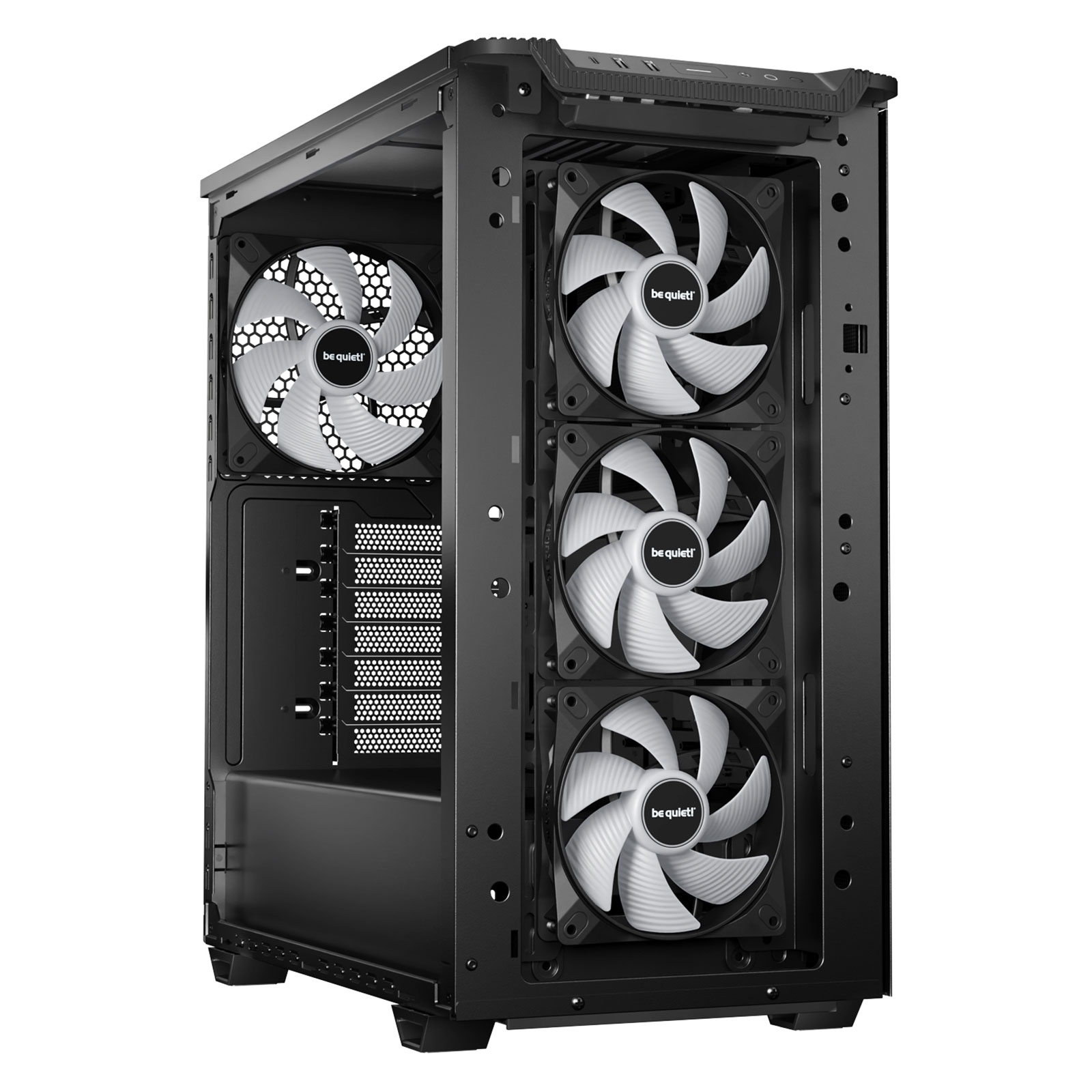 Façade : 3 x 120 mm ou 2 x 140 mm (3 x Pure Wings 3 120 mm installé) Dessus : 2 x 120/140 mm Arrière : 1 x 120/140 m (1 x Pure Wings 3 140 mm installé) |