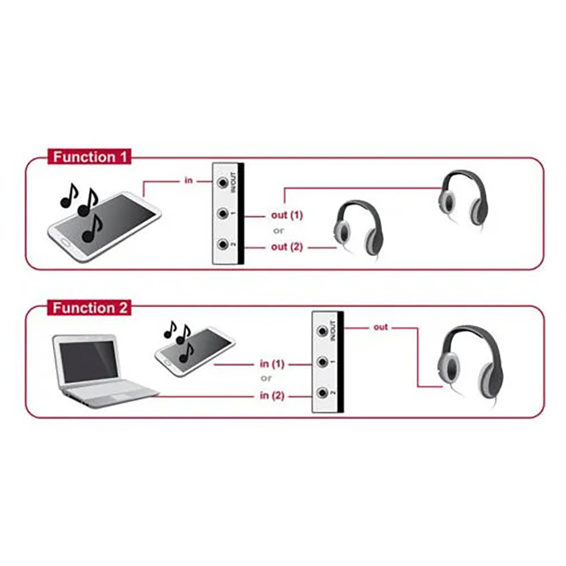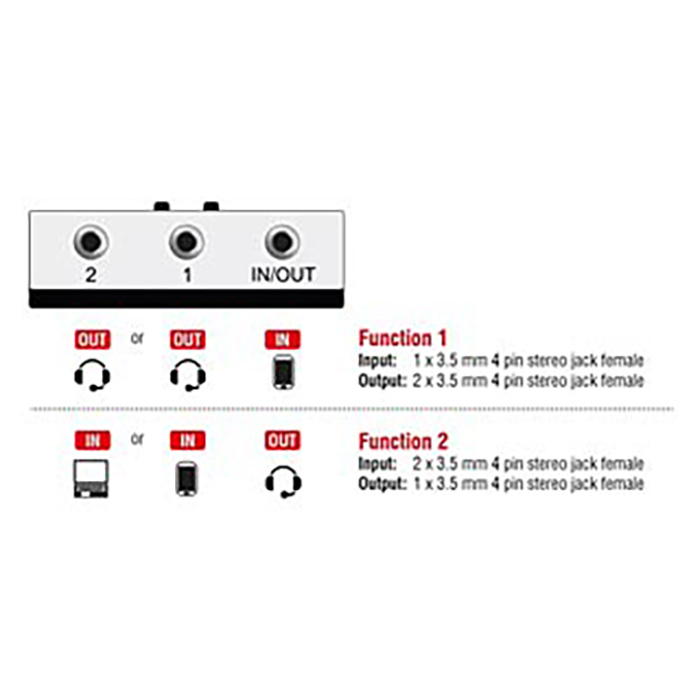 - Fonction 1 : entrée 1 x Jack 3,5 mm femelle / sortie 2 x Jack 3,5 mm femelles