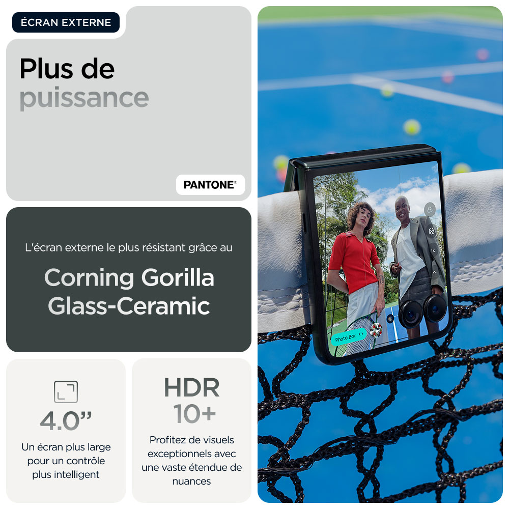 Avec le Motorola Razr 60 Ultra Scarab, profitez d’un format pliable pensé pour le rythme moderne : glissez-le en poche, puis dépliez un grand écran pour vos contenus. Son écran AMOLED 7" à 165 Hz apporte une sensation de fluidité idéale en jeu, en streaming ou sur les réseaux. L’écran externe flexible 4" facilite les actions rapides sans ouvrir le smartphone.