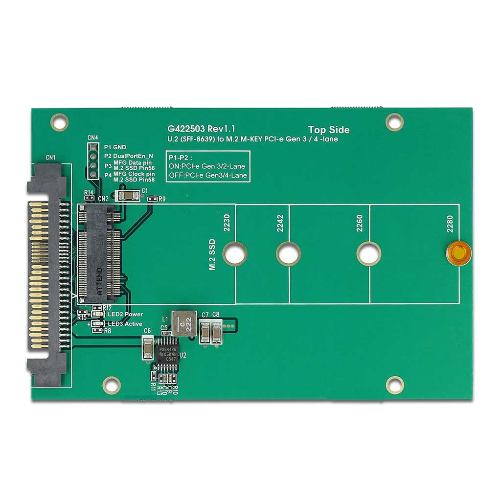 Conçu pour les formats 2230 / 2242 / 2260 / 2280, l’adaptateur accepte les modules M.2 Key M ou B + M basés sur PCIe, avec une prise en charge des configurations PCIe en 2 ou 4 voies via un cavalier. Idéal quand vous montez une configuration, que vous ajustez une baie de stockage ou que vous cherchez un montage net, compatible aussi avec des SSD double face.