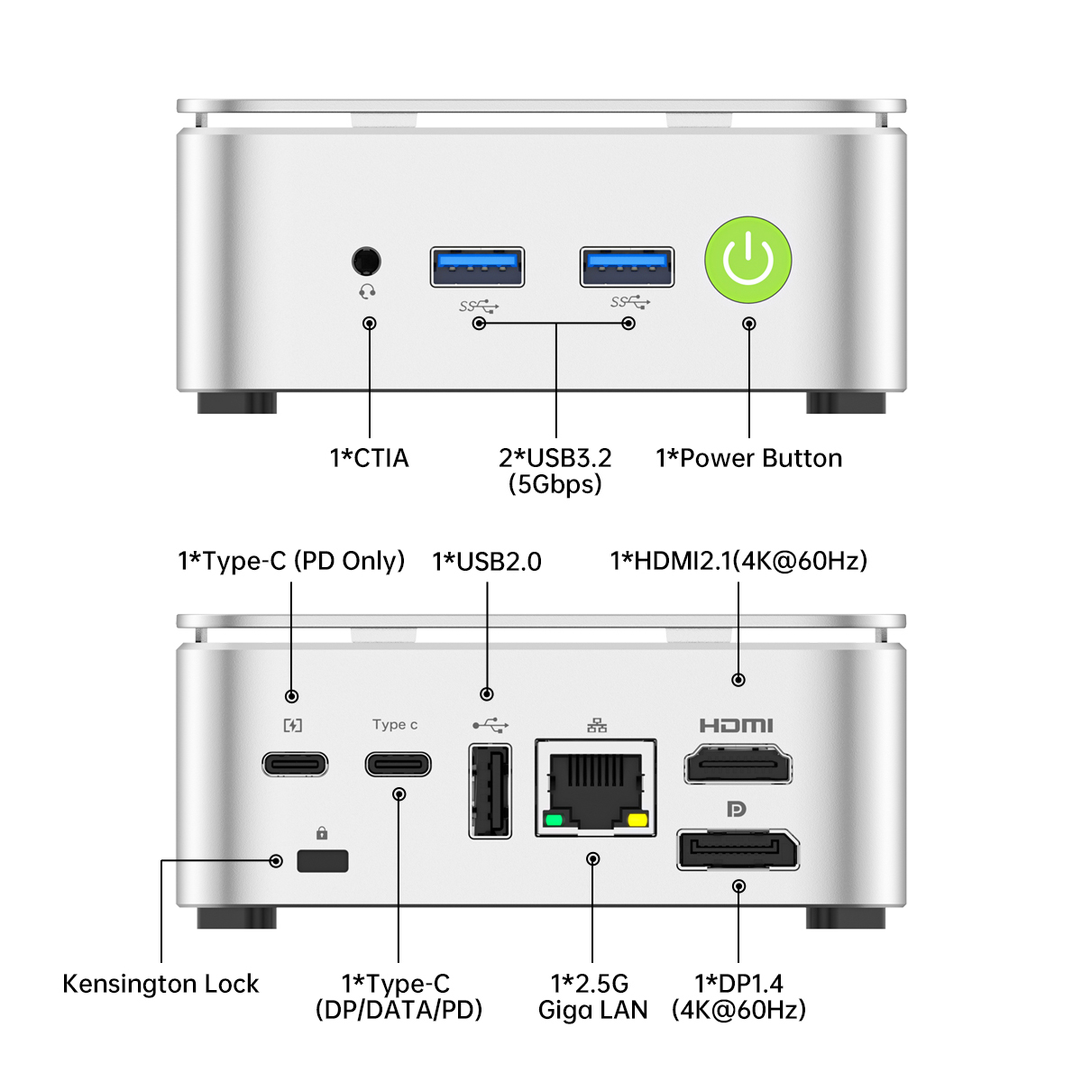 Conçu pour s’intégrer dans tous les environnements, ce mini PC associe format ultra-compact et connectique complète : Ethernet 2.5G, Wi-Fi 5 et Bluetooth 5.0 pour vos périphériques et transferts. Son refroidissement à turbine en cuivre contribue à un fonctionnement agréable au quotidien, même en usage prolongé. Avec Windows 11 Professionnel préinstallé, vous êtes prêt à travailler dès la première mise sous tension.