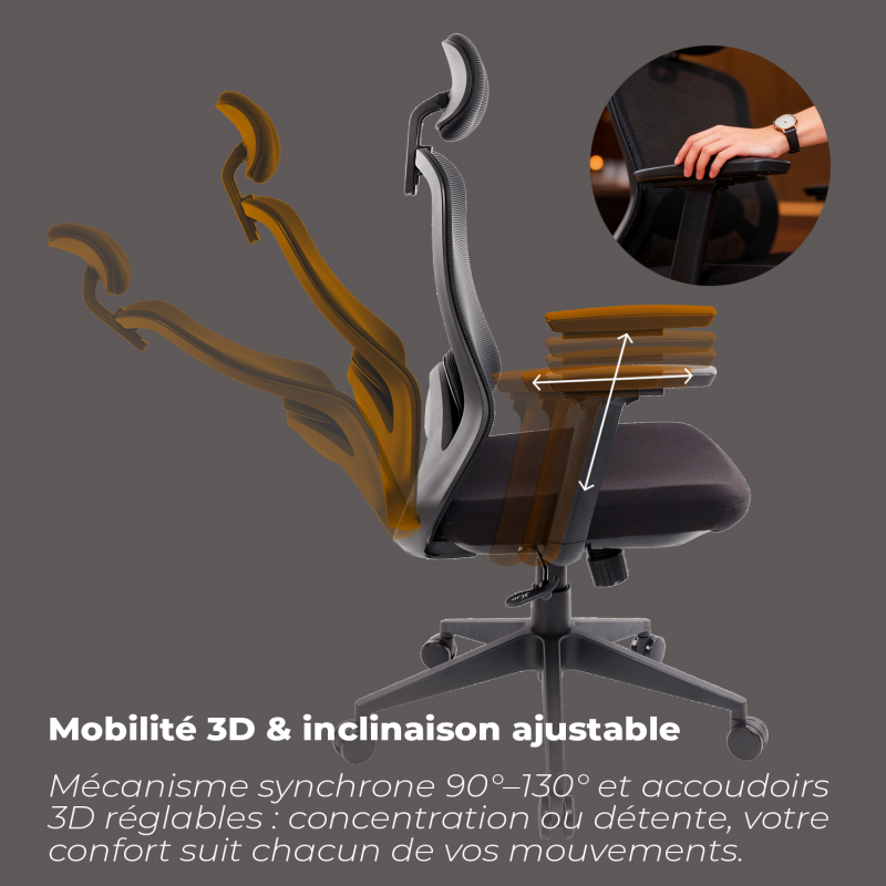 Siege en maille respirante - Soutien lombaire réglable - Repose-tête réglable - Accoudoirs 3D - Dossier inclinable - Poids maximal 120 kg