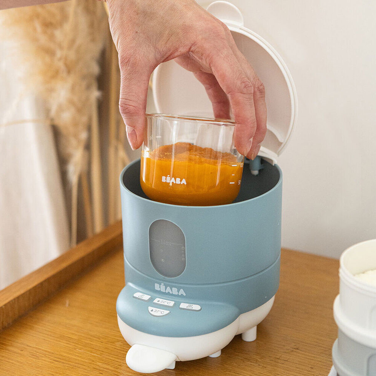 Au quotidien, il accompagnera aussi la diversification grâce à sa fonction réchauffage au bain-marie pour les petits pots. Le bloc de chauffe amovible se retire pour une manipulation plus facile et moins encombrante, puis se remplit d’eau avant programmation. Pensé pour vous simplifier la vie, l’appareil est facile à nettoyer et conçu pour s’intégrer naturellement à votre routine.