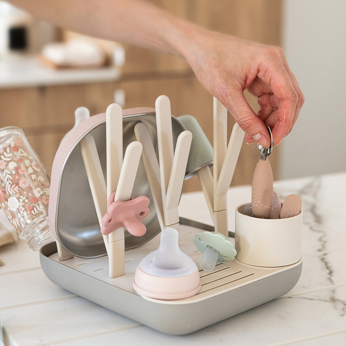 À la maison, l’Égoutte Biberon Forêt Clay Earth de Béaba accompagnera le quotidien en facilitant le séchage de la vaisselle de bébé. Sa grande capacité permettra de déposer jusqu’à 6 biberons grand format après le repas ou la préparation du soir. Son design pensé pour le plan de travail offrira un espace dédié, clair et pratique, pour éviter que les éléments ne s’éparpillent autour de l’évier.